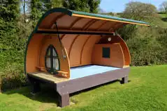 This cosy hut is ideal for two with a double bed and memory foam mattress (please bring you own bedding). Room to bring a small camp bed for a third person. There's a mini-fridge and also a wood burner to keep you toasty on cooler nights.