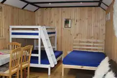These huts provide a luxury glamping experience. Inside there is a double bed, a triple sleeper bunk bed, a sofa, table and chairs, TV, microwave, kettle, small fridge and a heater.