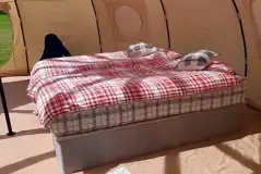Bell tent equipped with two single air beds, two single beds, and furniture. Bedding is included.