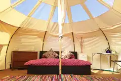 Stylish bell tents with a double bed inside, complete with bedding and two foldaway camp beds. These are furnished and include solar power, plus a kettle, cutlery and glasses, plus access to a gas cooker. You can add your own air beds to sleep six.
