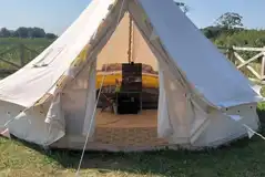 Furnished 5m bell tent with a double air bed and two single air mattresses, all bedding included. Decorated with bunting and fairy lights inside, as well as an electric socket plus outdoor seating outside. Shared facilities nearby. Sorry, no pets.