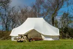 Bell tents with a double bed. Includes bedding, a storage chest and a wood burning stove. Outside is a seating area. Shared facilities nearby. Dog friendly.