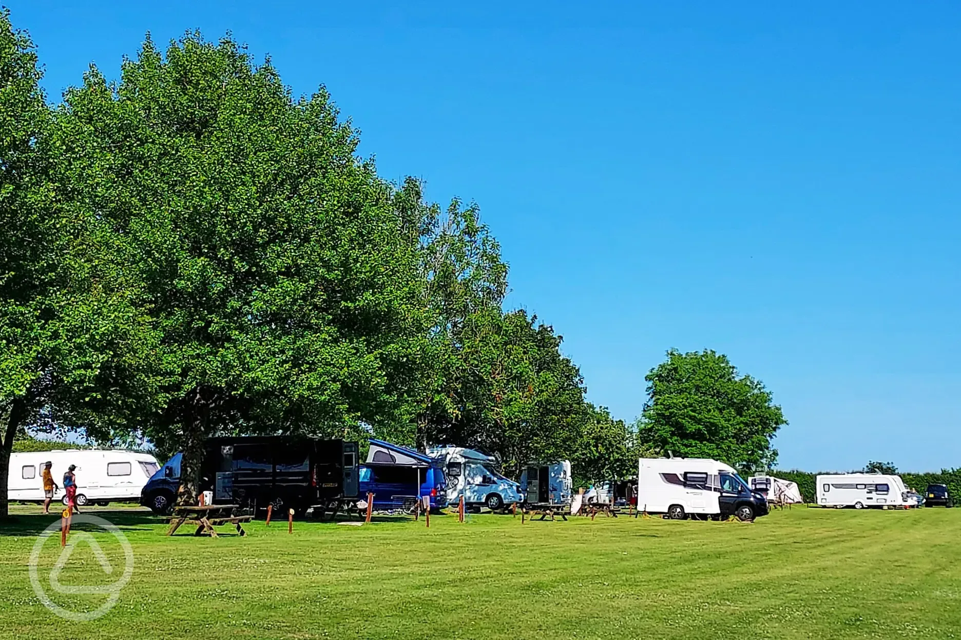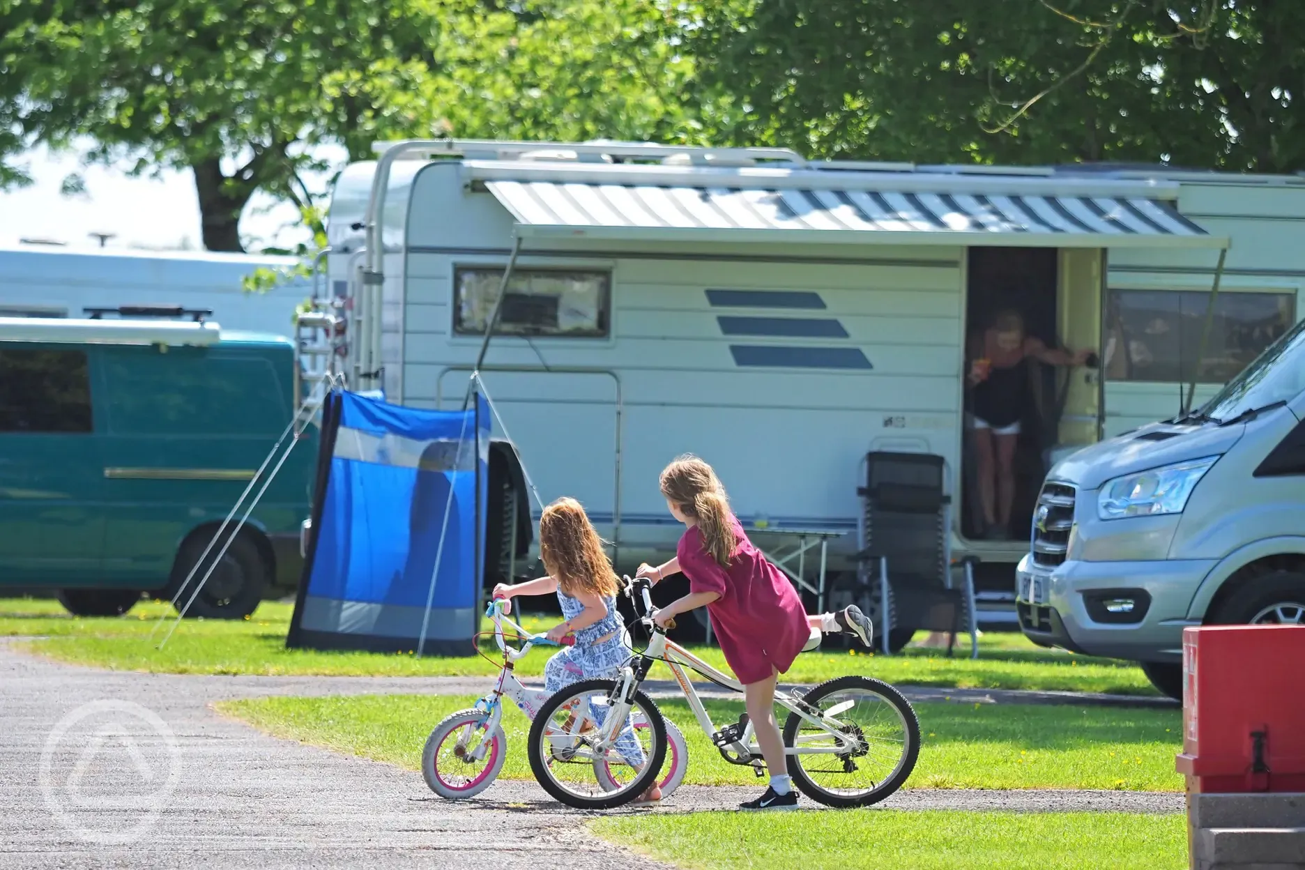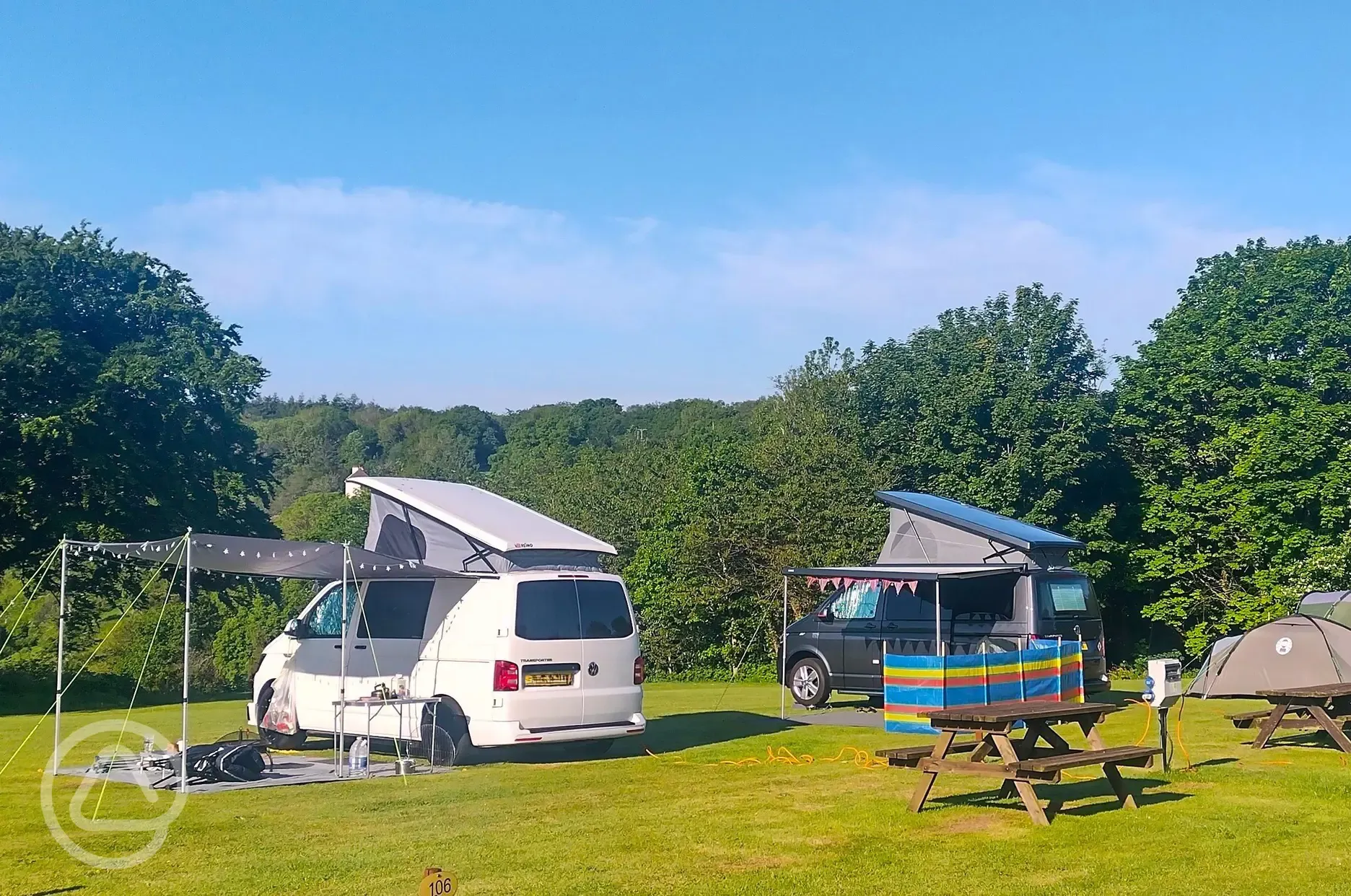 Hardstanding pitches with electric and water hook up in the park and the meadow, suitable for caravans, campervans or trailer tents. The maximum unit size is 9m x 9m.
