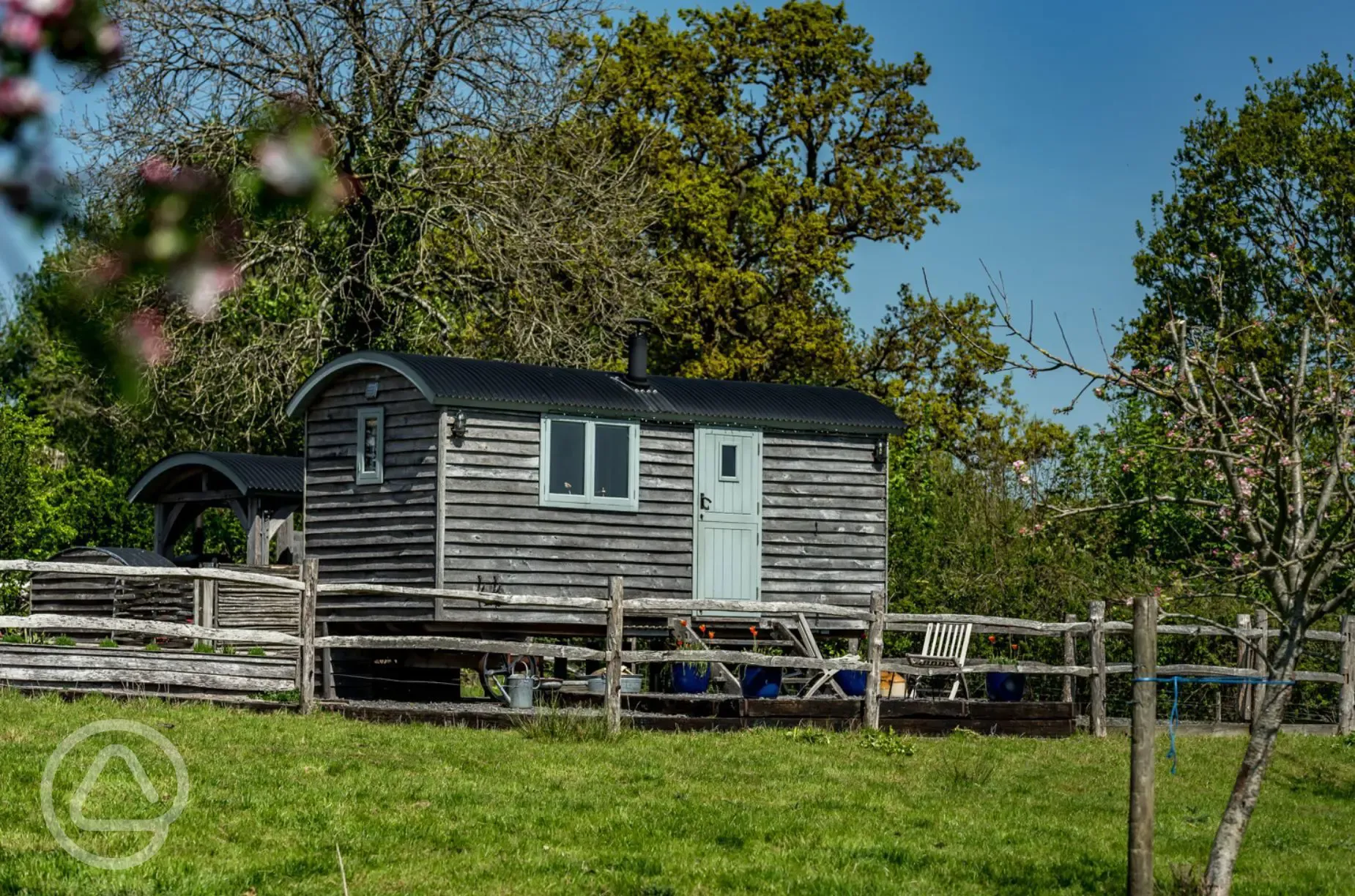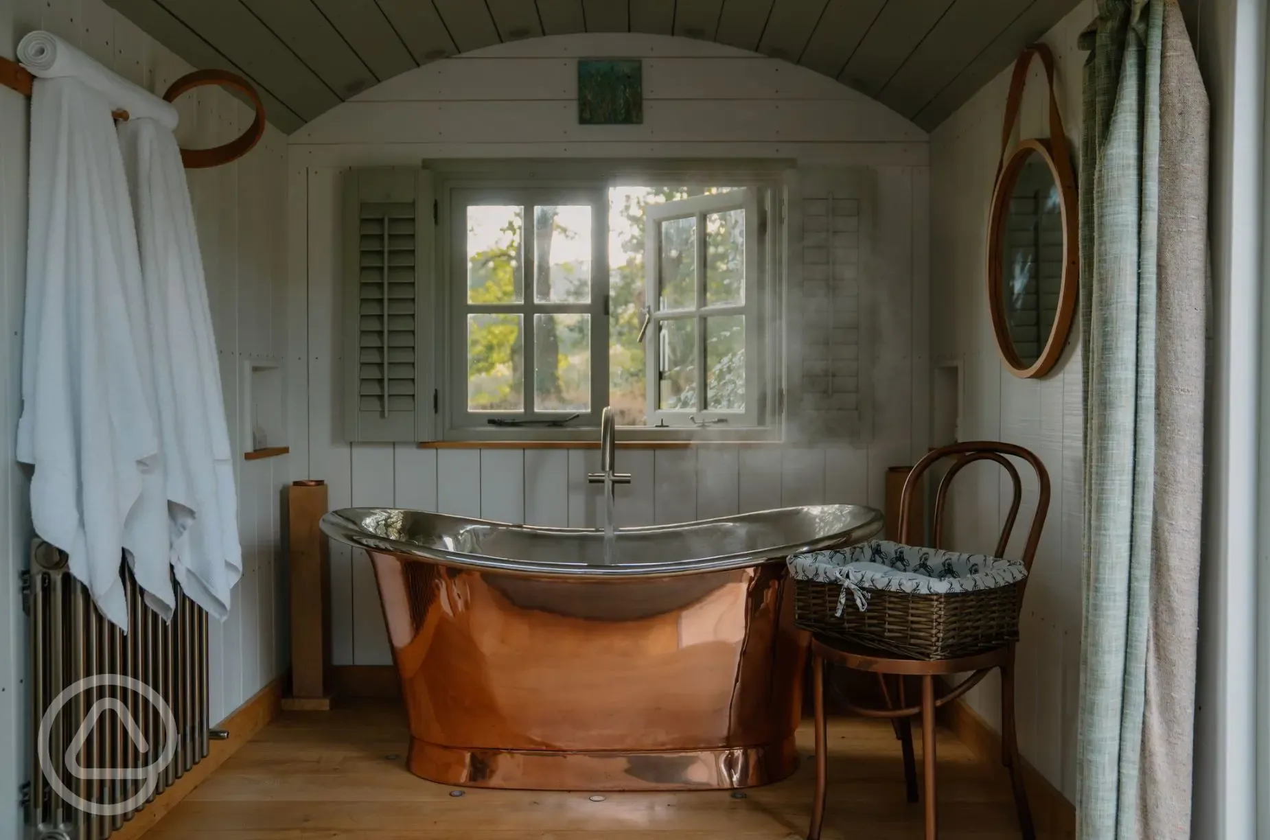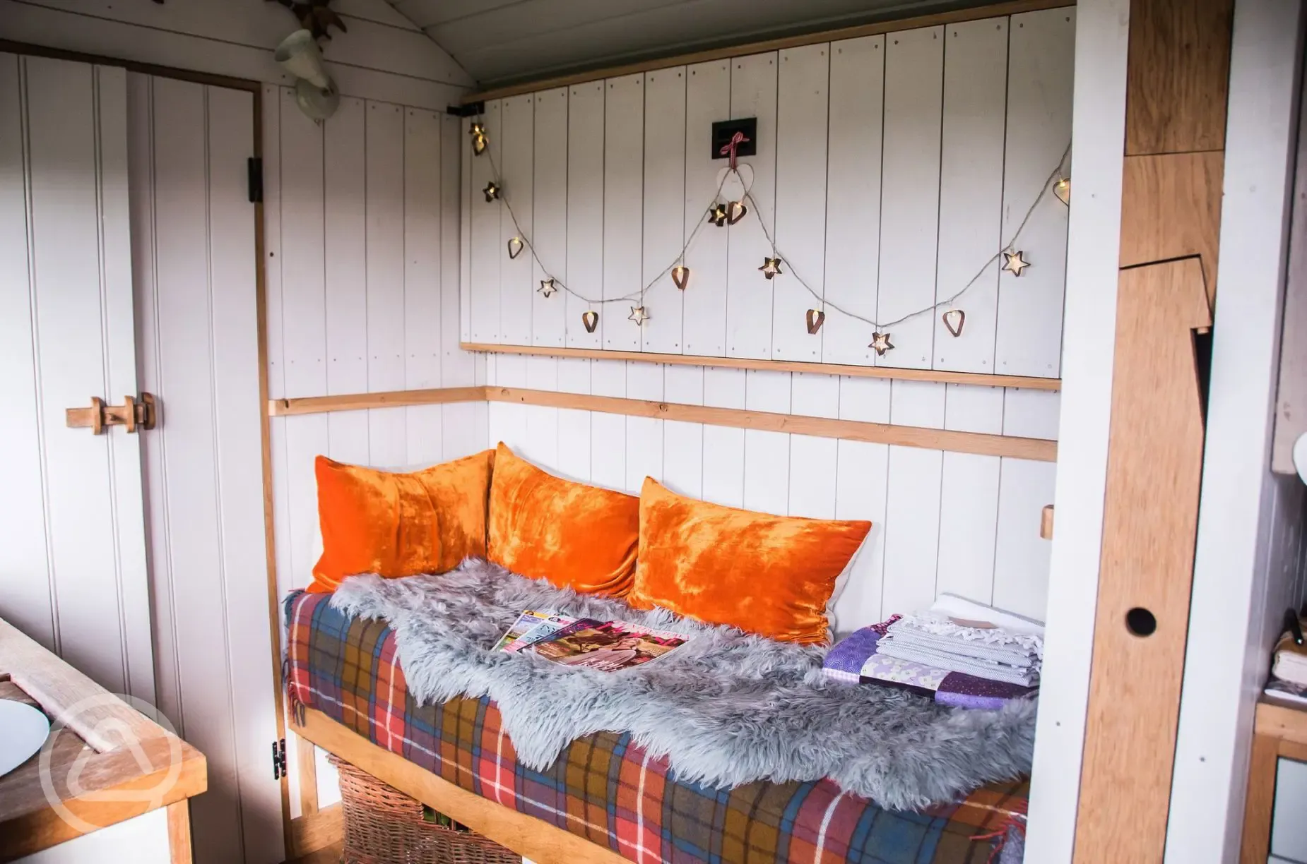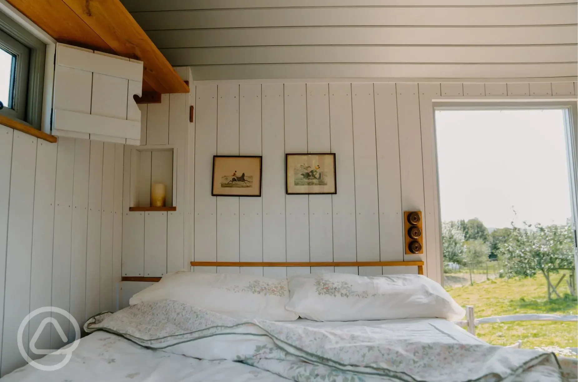 Beautifully finished shepherd's hut, designed to feel like a luxury hotel. The hut is 18 feet long and contains a double bed, seating, kitchen area and a bathroom with shower and flushing toilet.