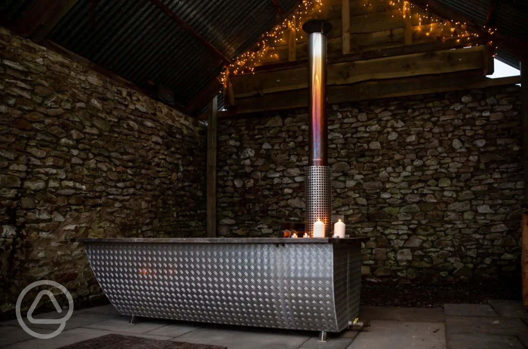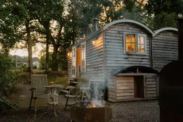 Local artisans designed the huts with owners Emma and Andrew helping every step of the way, right down to choosing the special copper light switches. One sprawling shopping spree later, and they were festooned with cosy yesteryear treasures and vintage pieces. Emma even designed the cushions herself! The wood burners are all set up, all you need to do is put a match to it then lounge on the daybed listening to the owls, or retreat to the comfy double bed with a pot of tea, a book and a plate stacked high with buttered toast. You'll have everything you need for everyday life, sprinkled with little luxuries like a game of chess or a sip of fine wine from vintage glasses. There's a fire pit just outside each hut so you can barbecue over a wood fire, or try the garden oven to roast your chicken. A wood fired hot tub is also right outside each shepherd's hut for you to soak in too. Inside, there's a gas hob for any rainier days when you want to tuck into a hot supper whilst keeping dry. You can buy fresh produce from the farm itself, like lamb burgers and juicy sausages, as well as gourmet picnic hampers. The site has received the Visit England gold award.