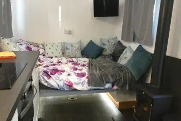 Sleeping two, the hut includes a double bed, table, an ensuite, full kitchen facilities, fridge, oven, hob and grill. A smart TV is located on the wall with Netflix.