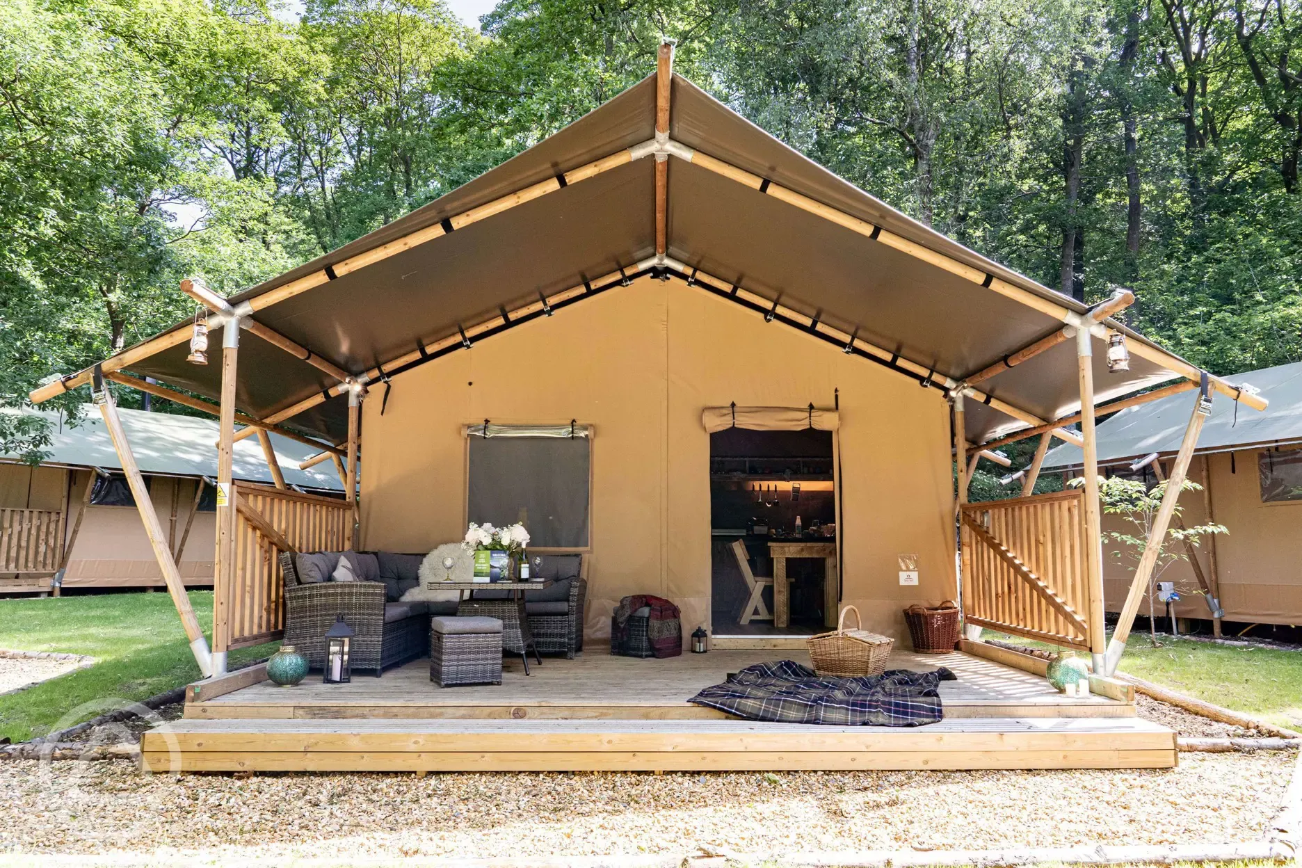 Fully equipped safari tents sleeping up to six guests. Each includes a double bedroom, one twin room, and a secret double bed hidden in a cabin in the wall. They also have modern bathrooms, log burning stoves, and Chesterfield suites.