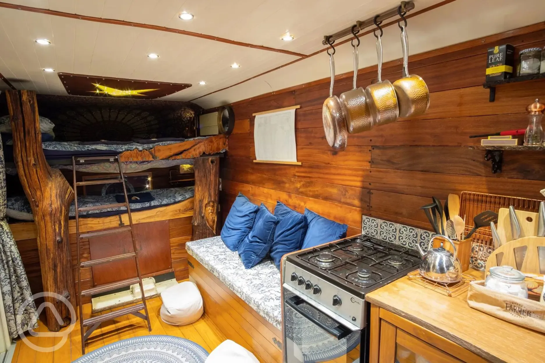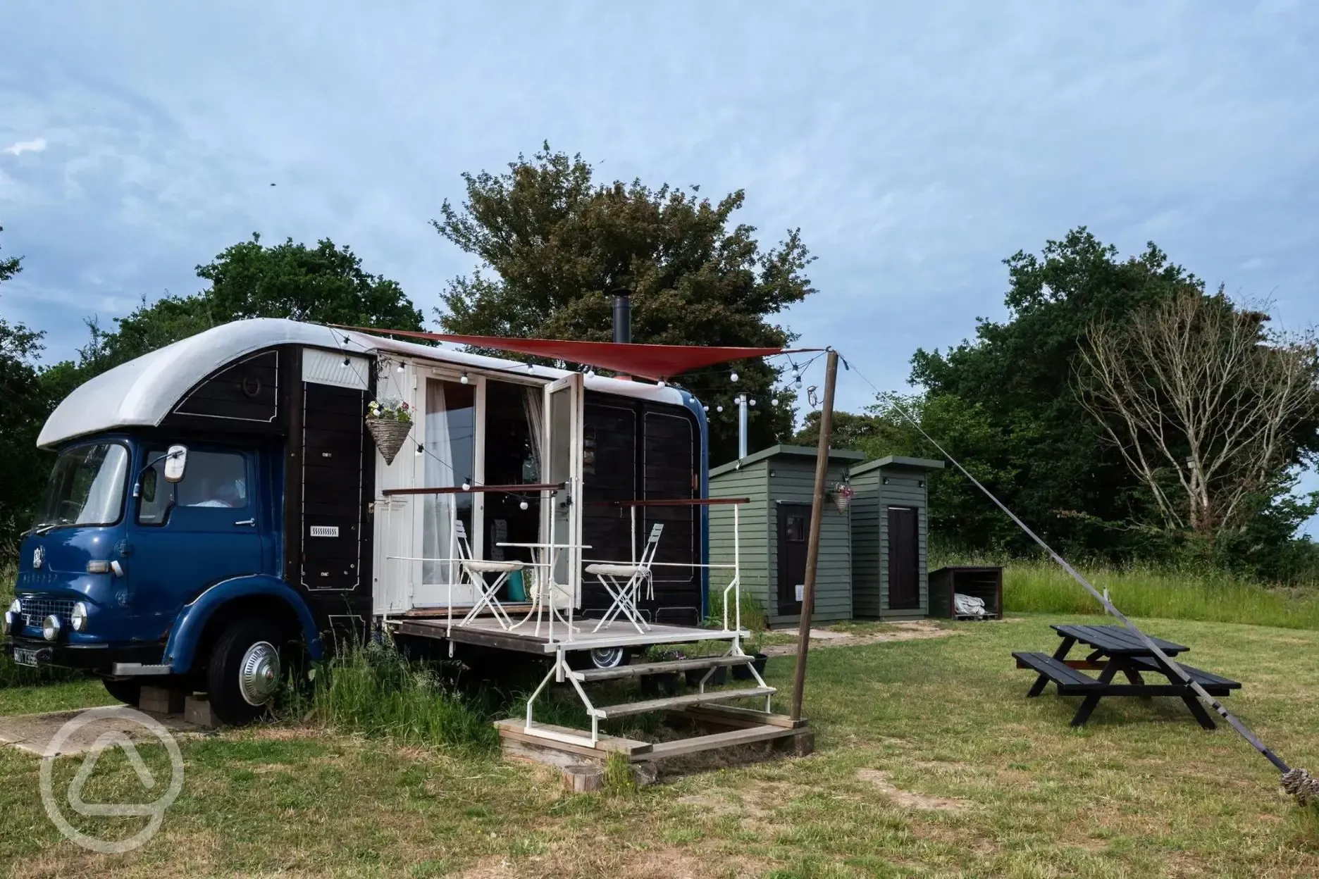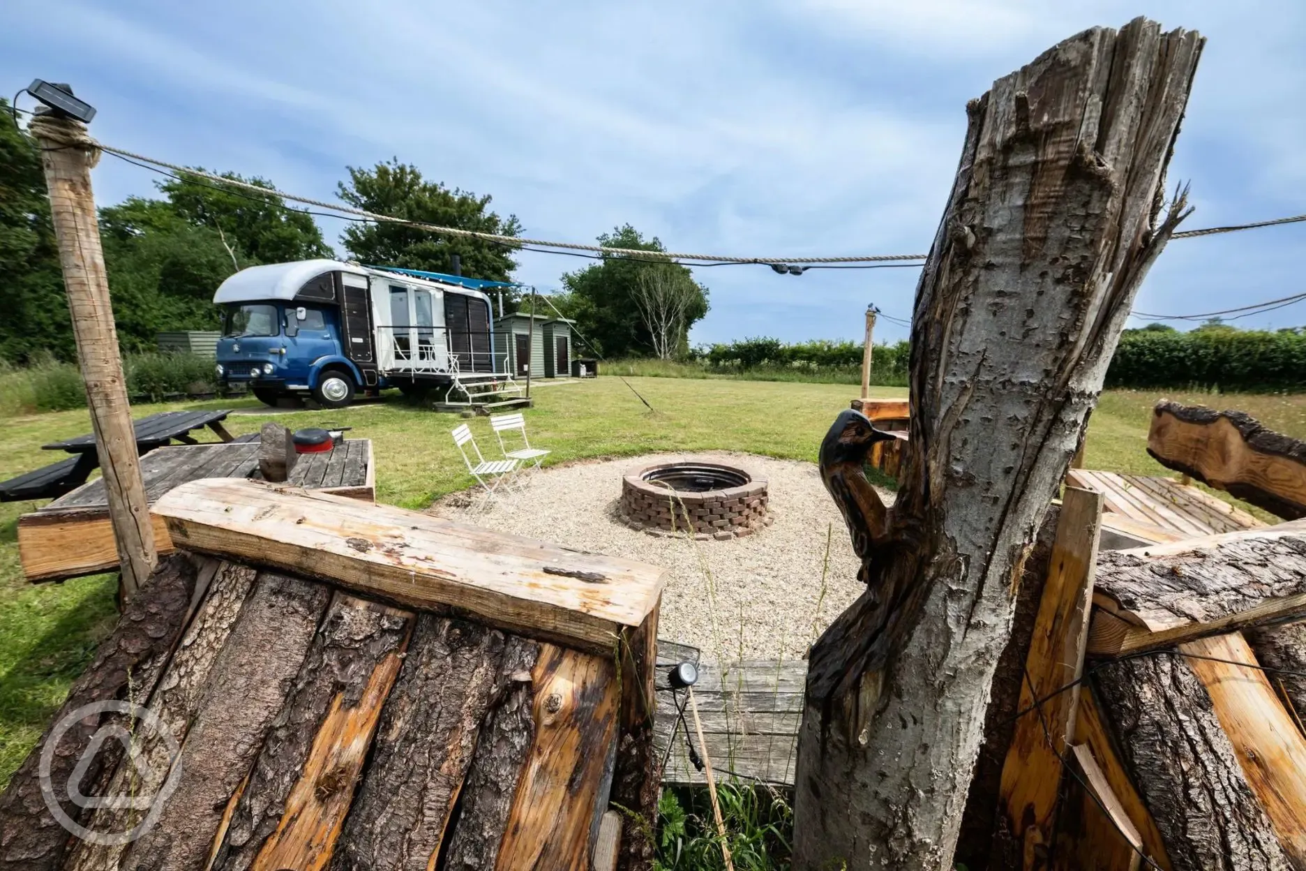 Converted horse lorry, with a double bed, a smaller bed for a child/small adult (bedding provided) and a small sofa bench (bedding not provided). Private facilities and a fully equipped kitchen with a seating area. Outside is a fire pit, table and chairs.