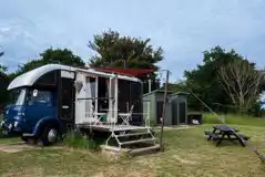 A beautifully furnished converted trailer with a double and a sofa bed. Fully equipped kitchen and two outside decking areas with seating and fire pit. USB sockets and a high quality blue-tooth sound system throughout. Private facilities nearby.