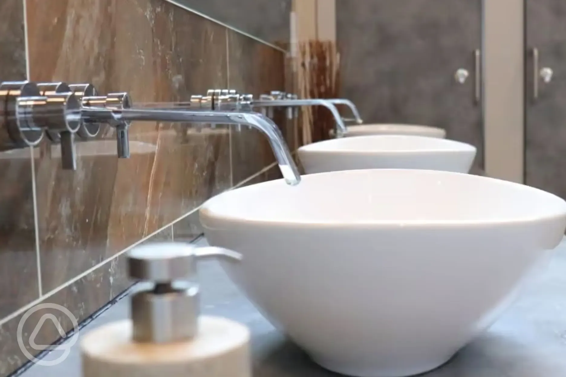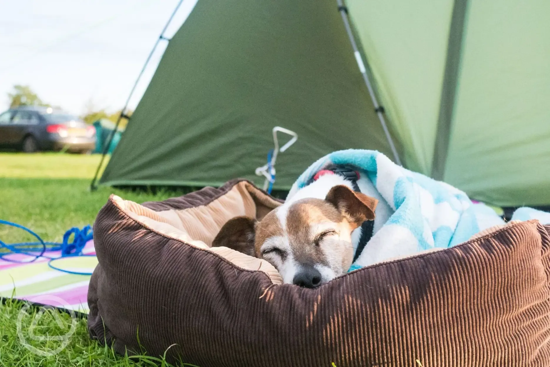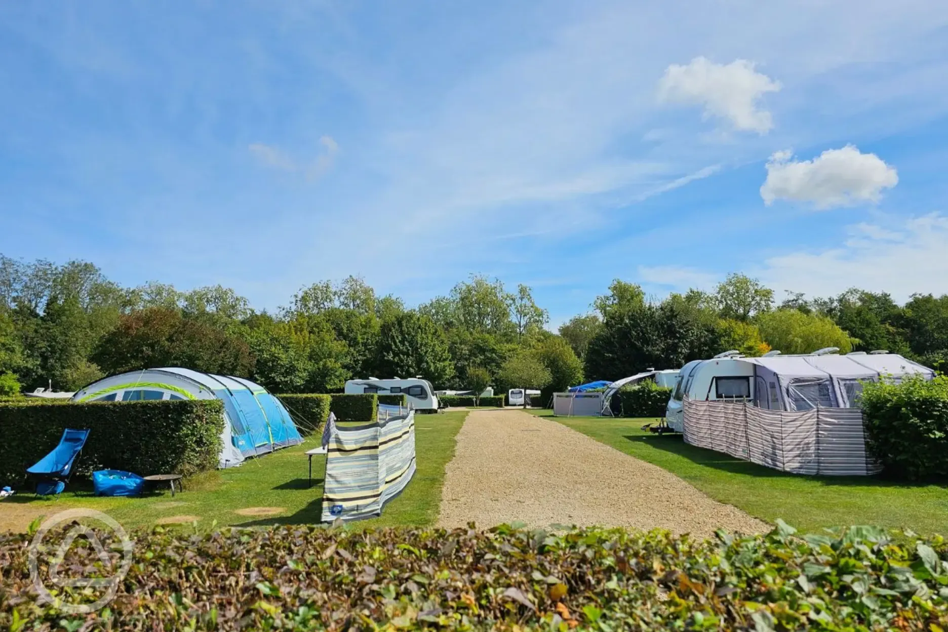 Fully serviced 12m x 12m grass pitches equipped with a 16 amp electric hook up, drinking water, a water waste disposal, WiFi, and TV points. Pitches are suitable for tents, caravans, campervans, RVs, and motorhomes.