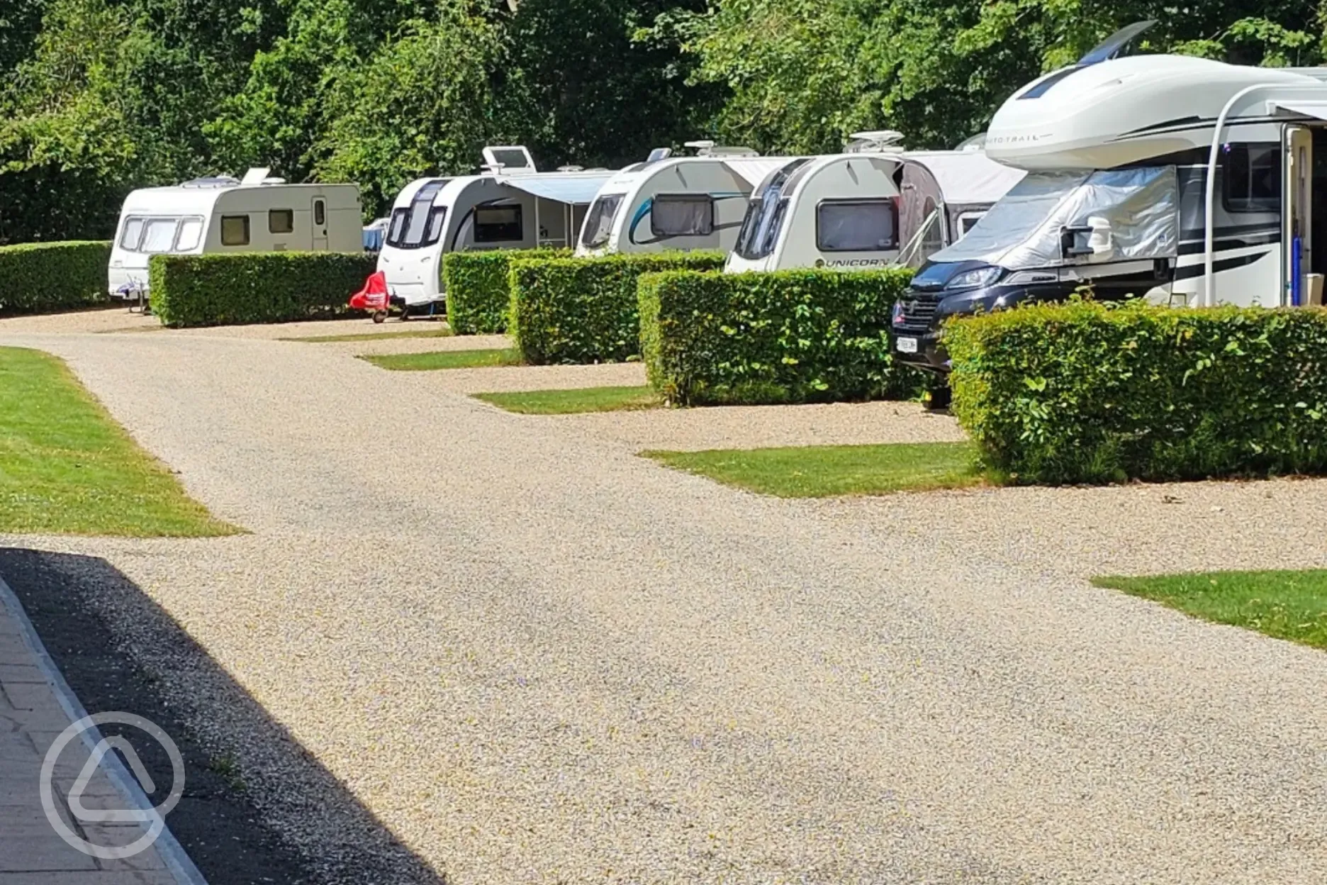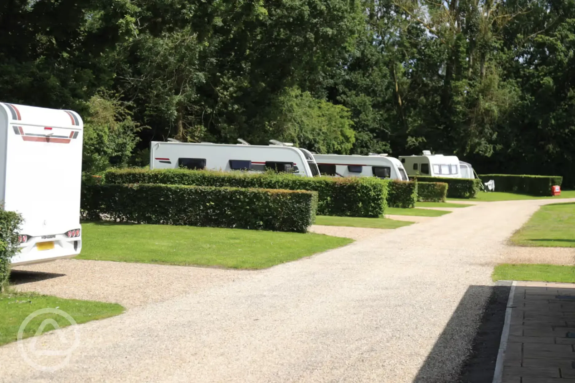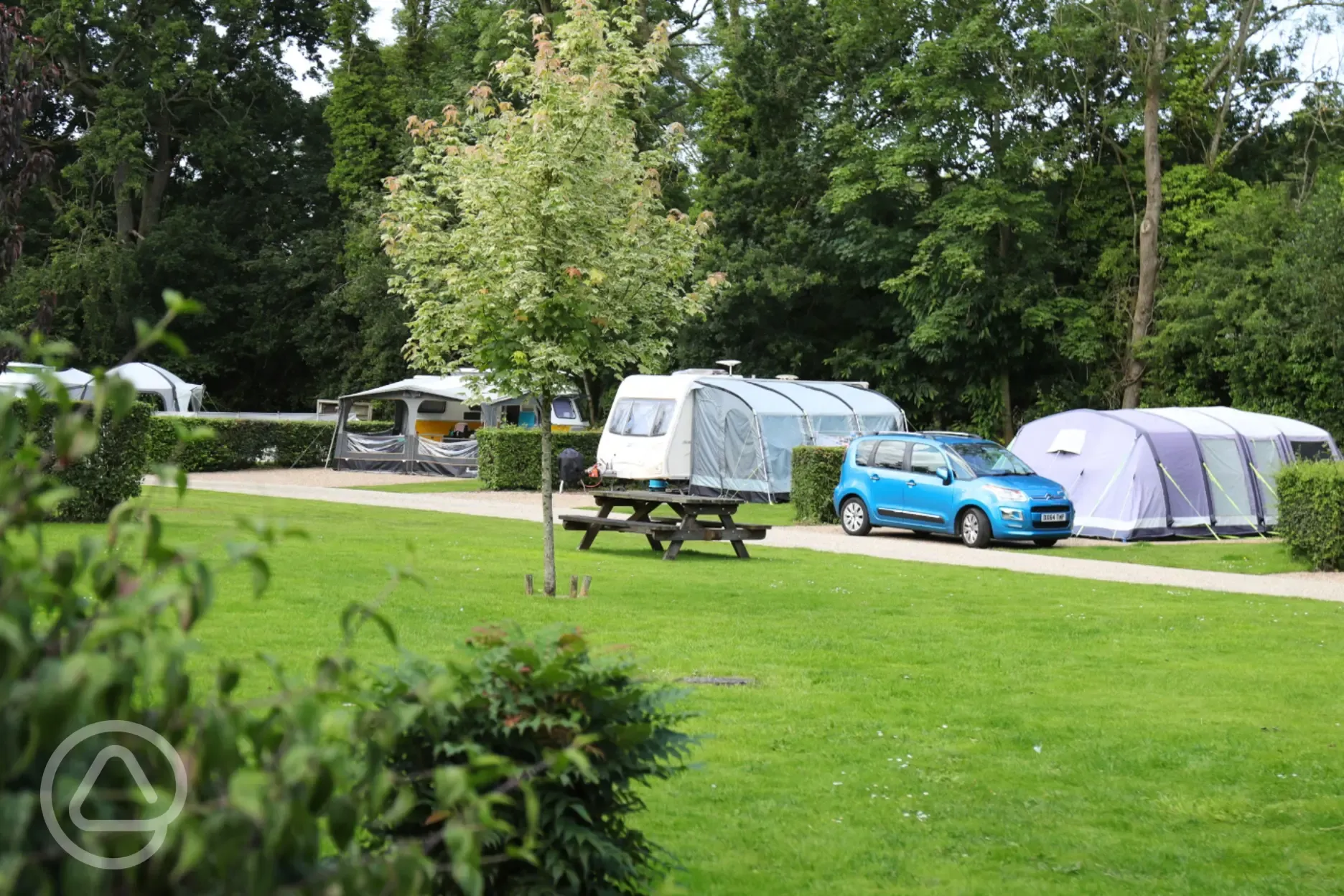 Fully serviced 13m x 13m hardstanding pitches equipped with a 16 amp electric hook up, drinking water, a water waste disposal, WiFi, and TV points. Pitches are suitable for tents, caravans, campervans, RVs, and motorhomes.