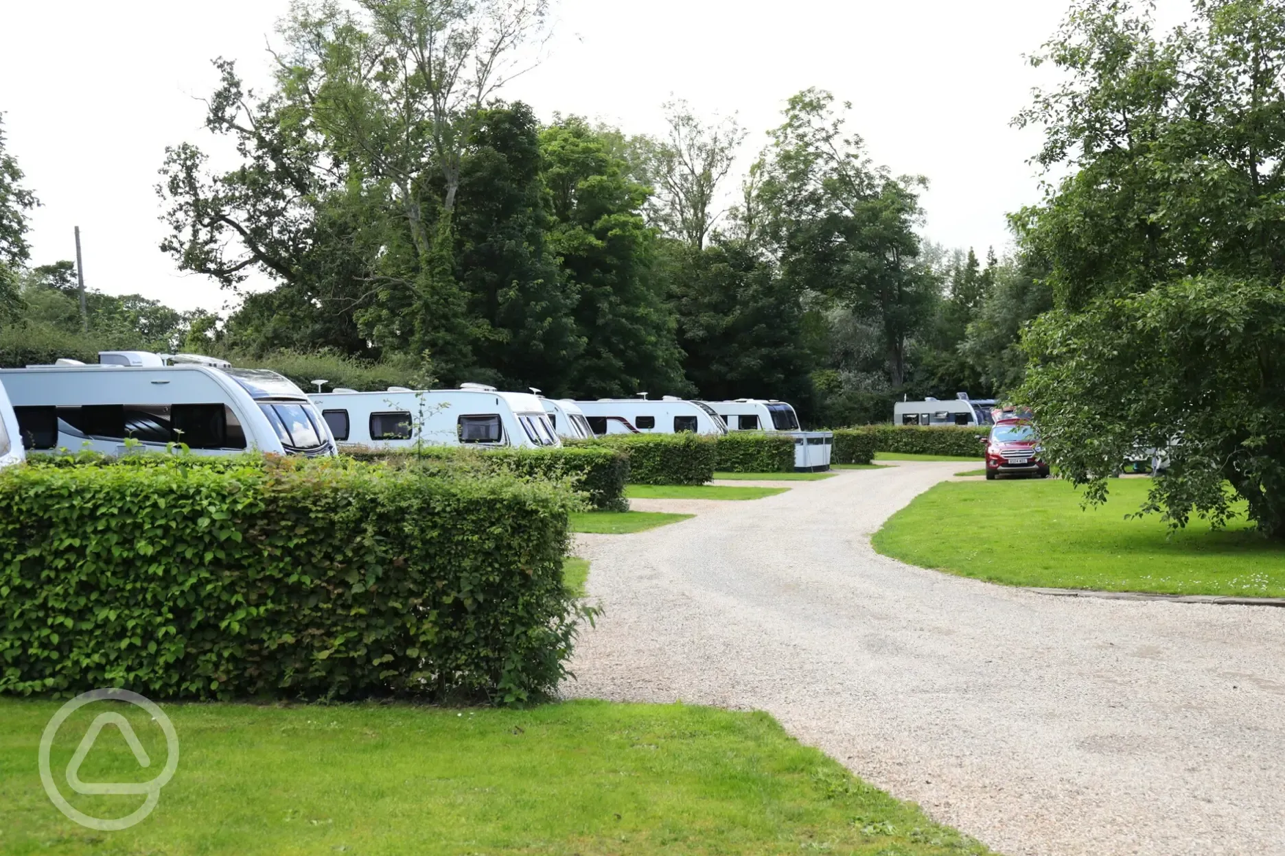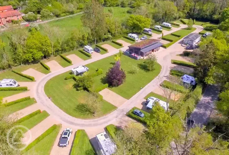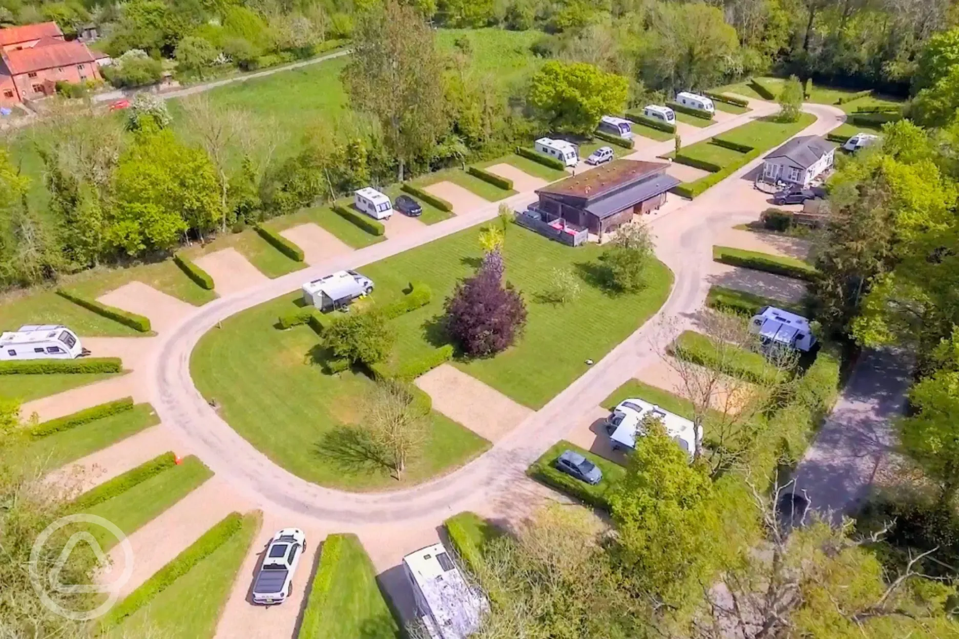Fully serviced 13m x 13m hardstanding pitches equipped with a 16 amp electric hook up, drinking water, a water waste disposal, WiFi, and TV points. Pitches are suitable for tents, caravans, campervans, RVs, and motorhomes.