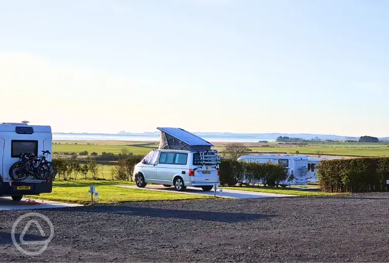 Electric hardstanding touring pitches, all pitches have an open view to the coast and grass space for an awning. They are suitable for campervans, caravans and motorhomes up to 9m long.