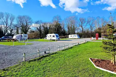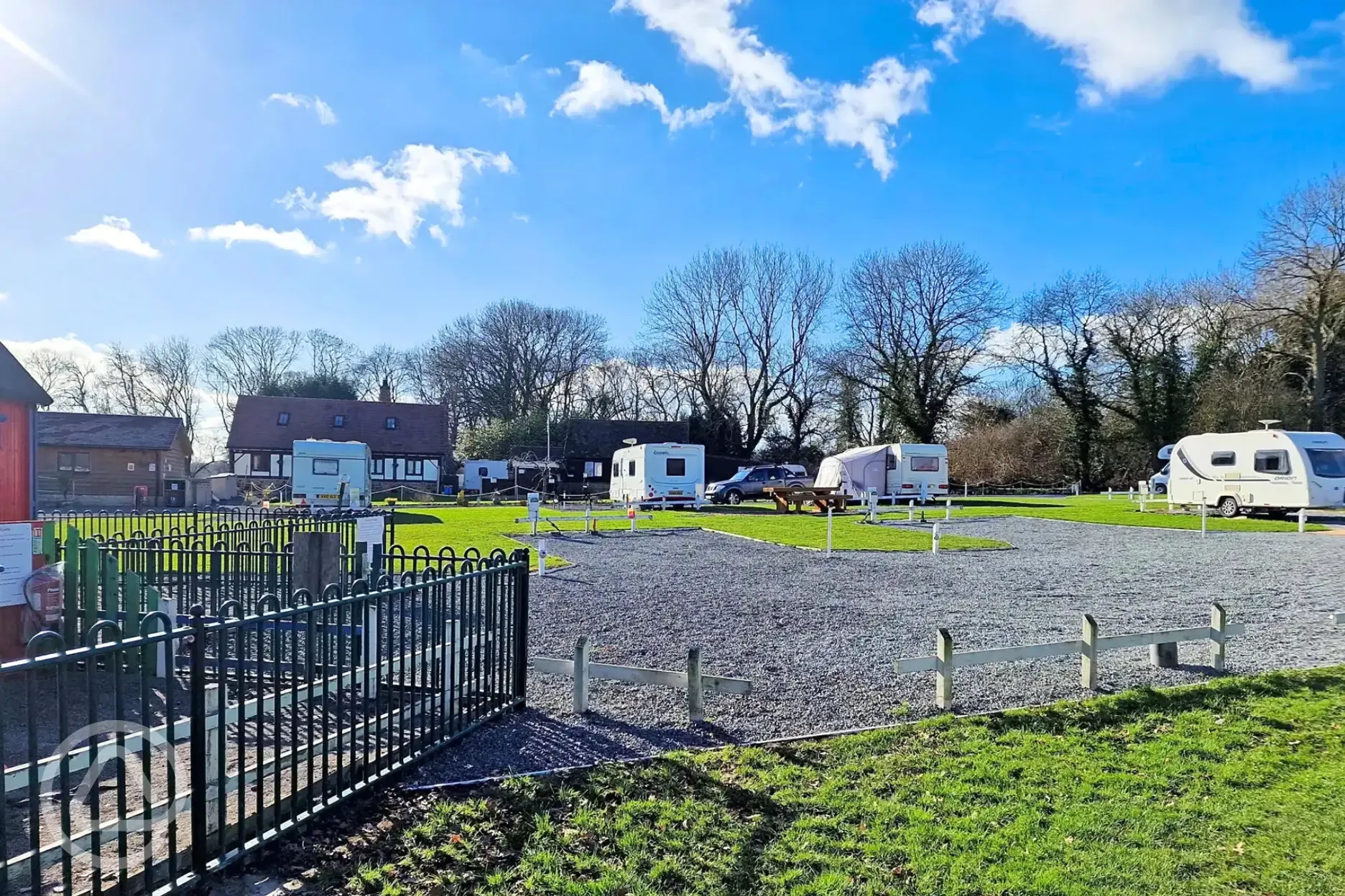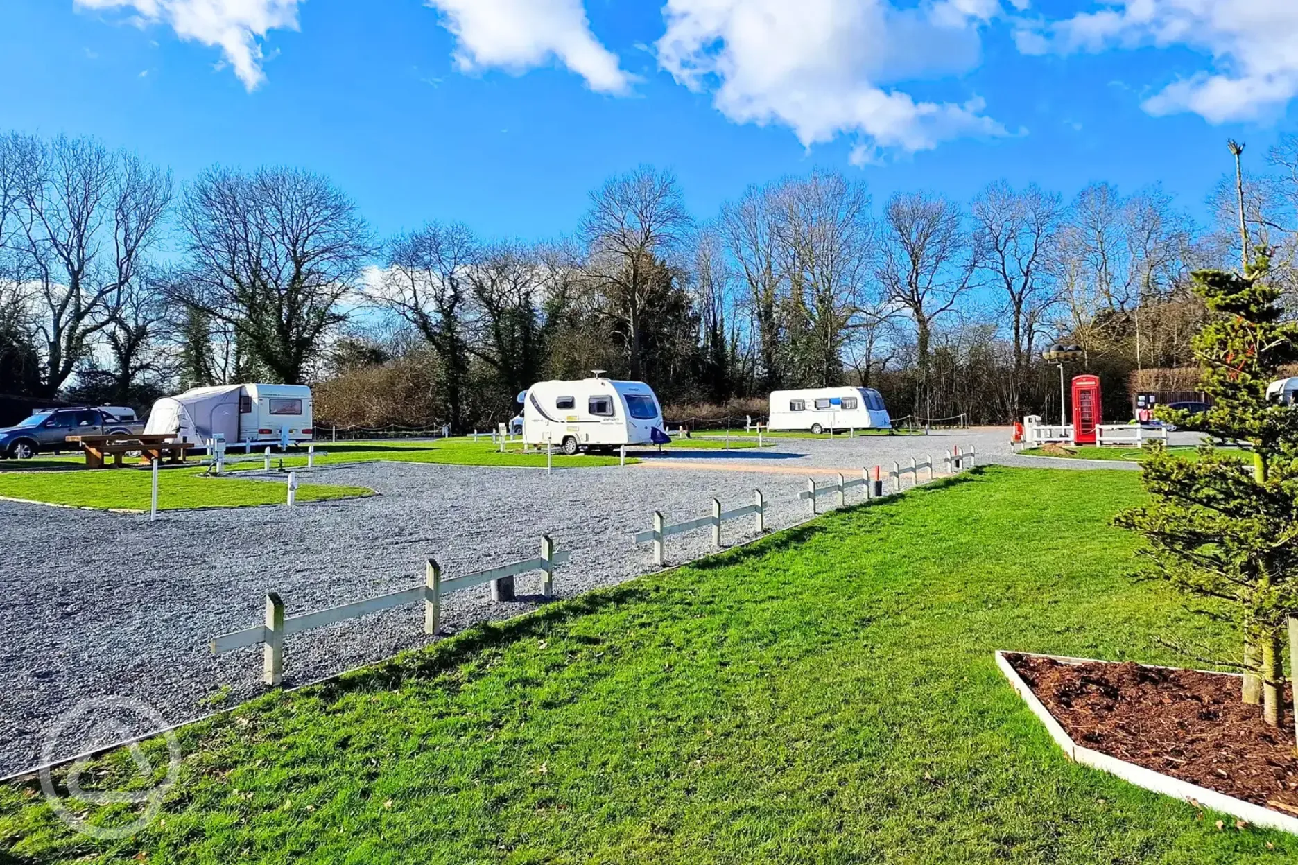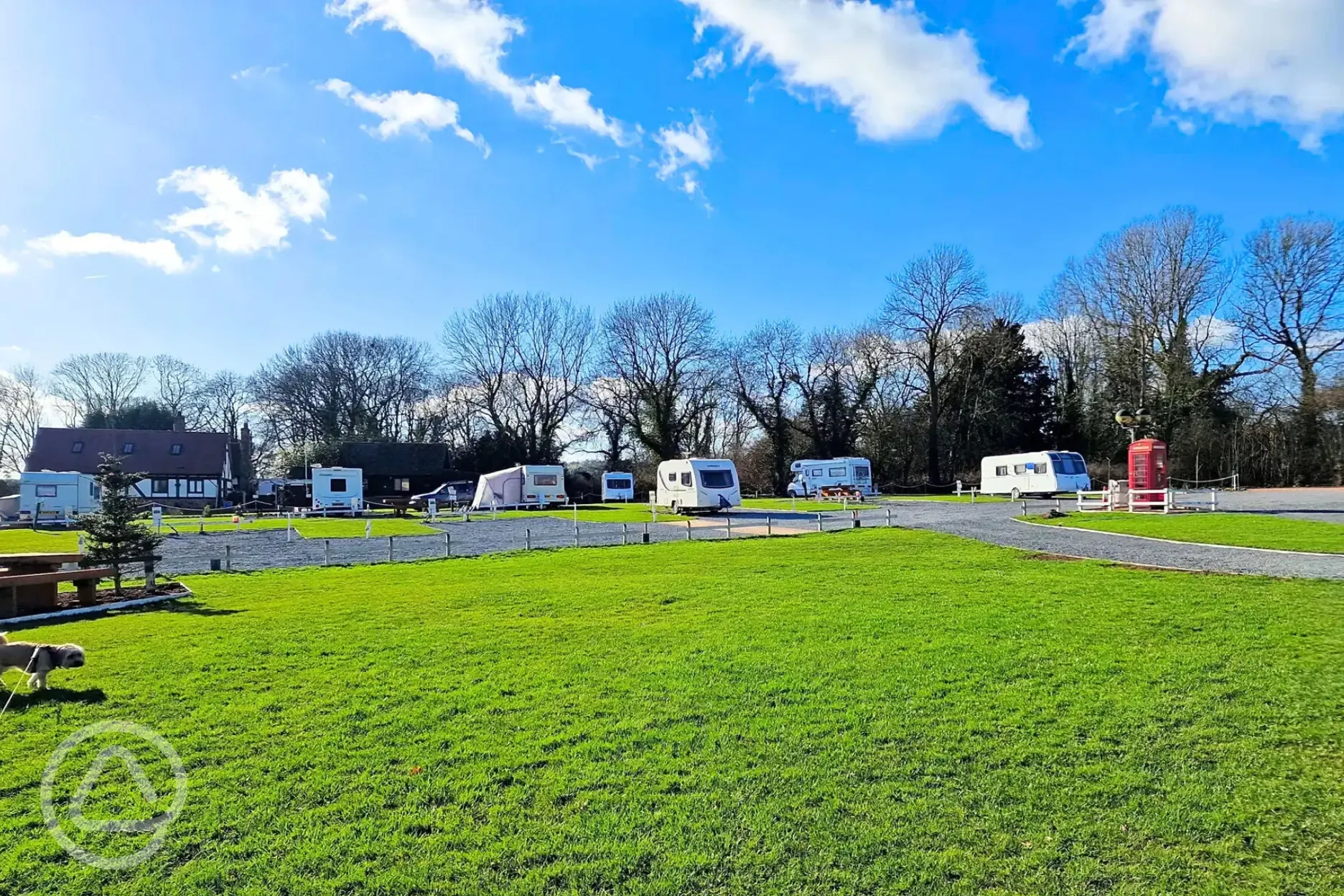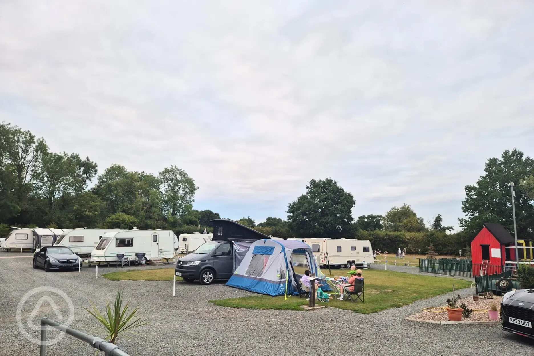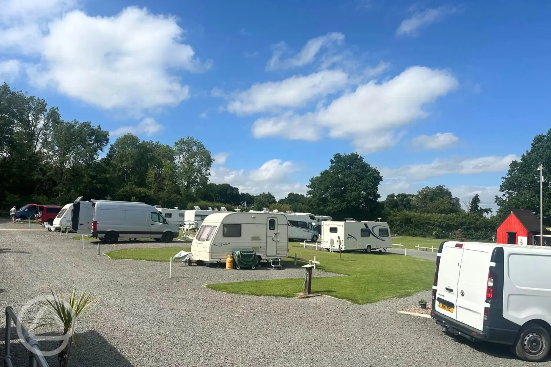 6m x 8m hardstanding pitches with 16 amp hook up for a fee. Suitable for campervans, caravans, and motorhomes with a space for car parking. Gazebos, awnings, and twin-axle vehicles are accepted.