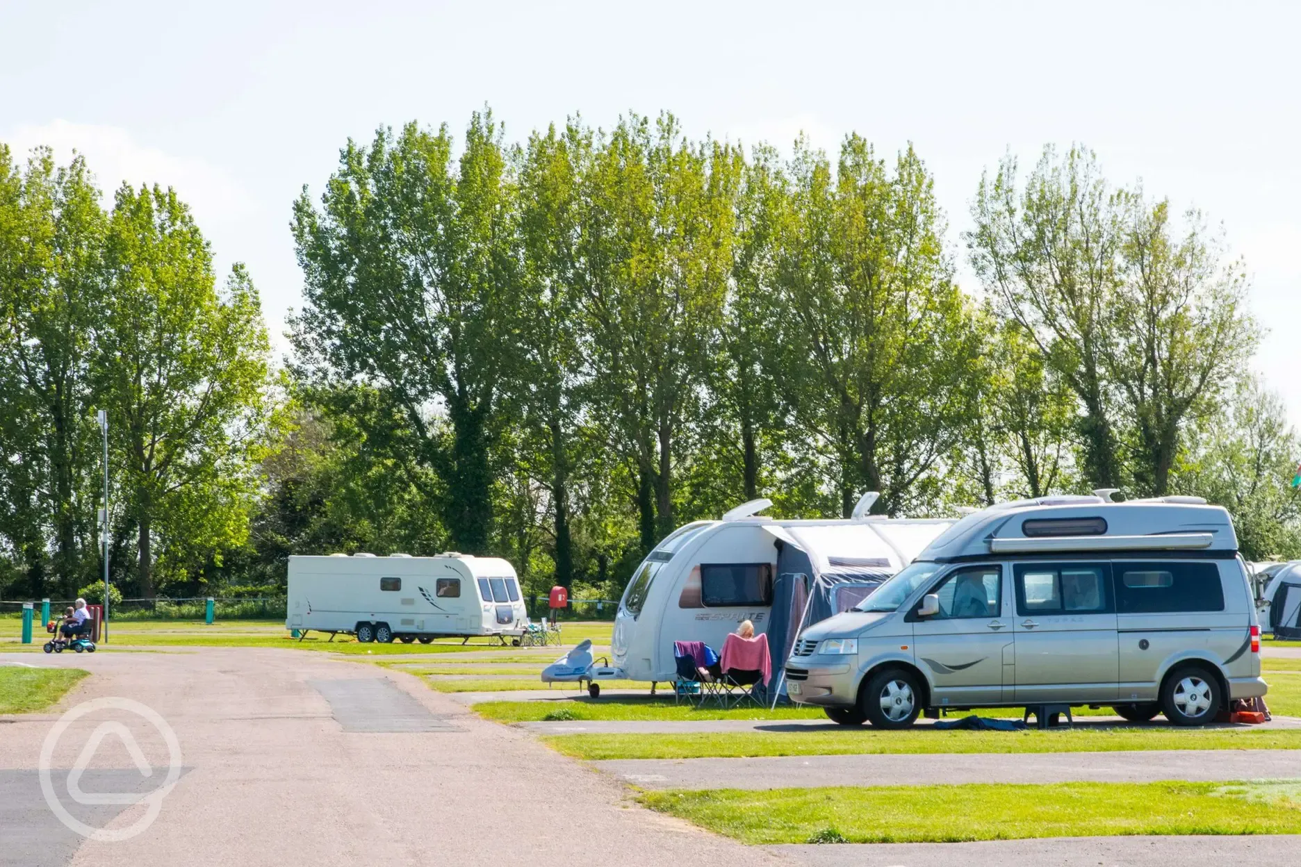 Hardstanding pitches with electric hook up in the grass field. This field is closest to the play area, so ideal for families with young kids. Suitable for tents and tourers.