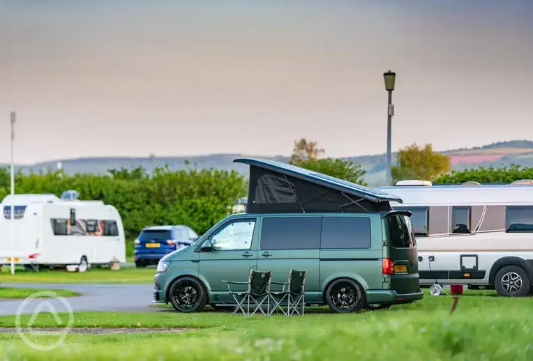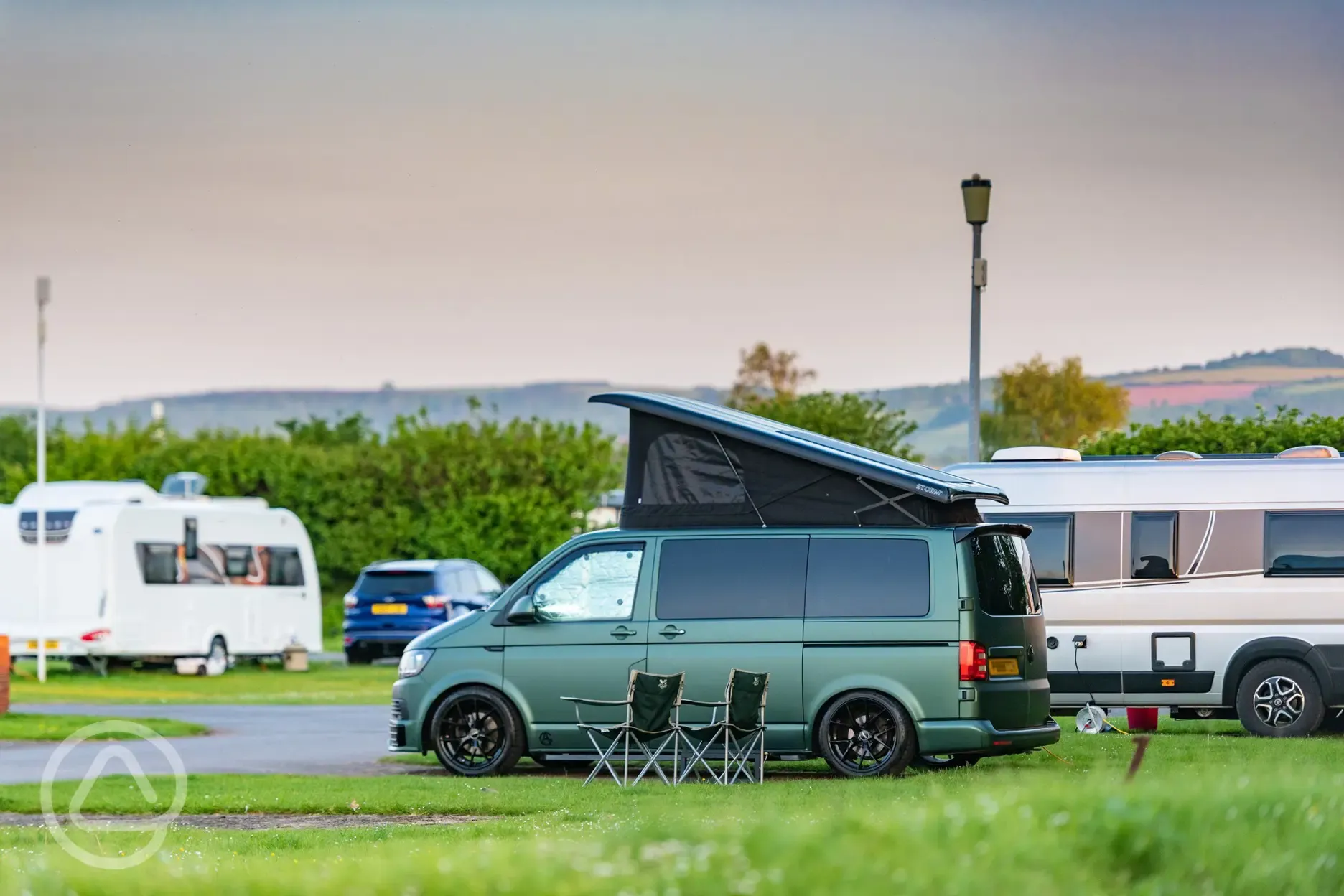 Hardstanding pitches with a 10 amp electric hook up for caravans, campervans and motorhomes.