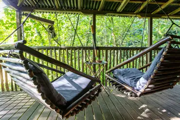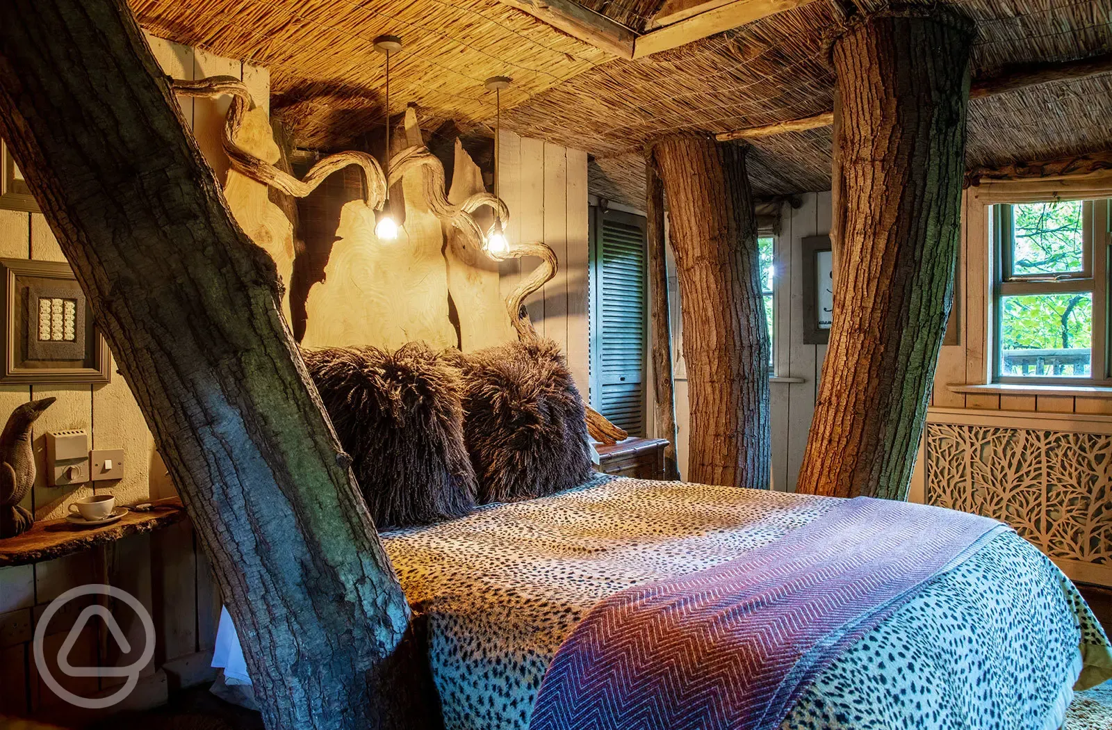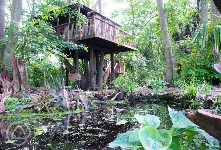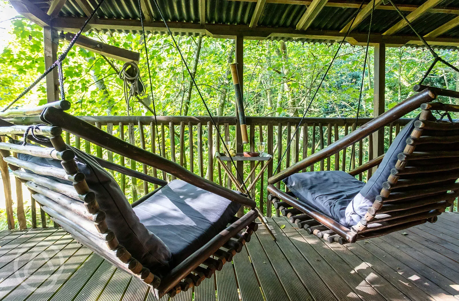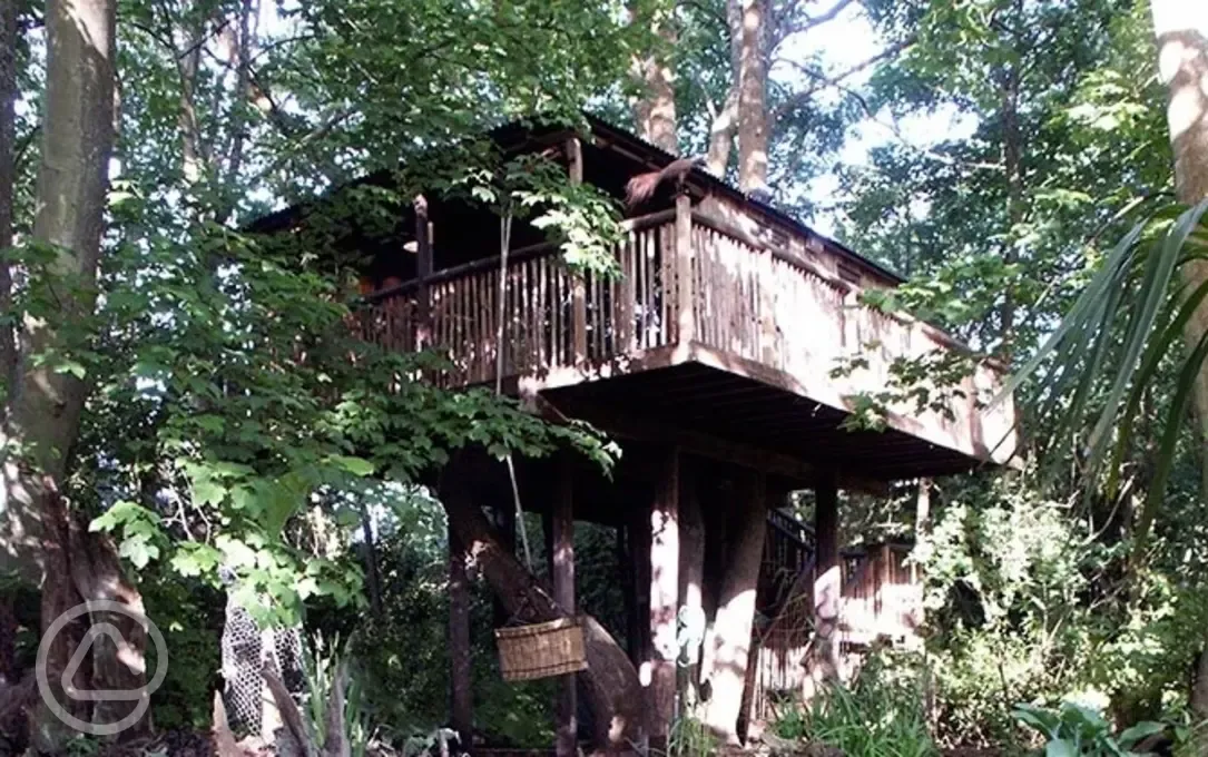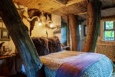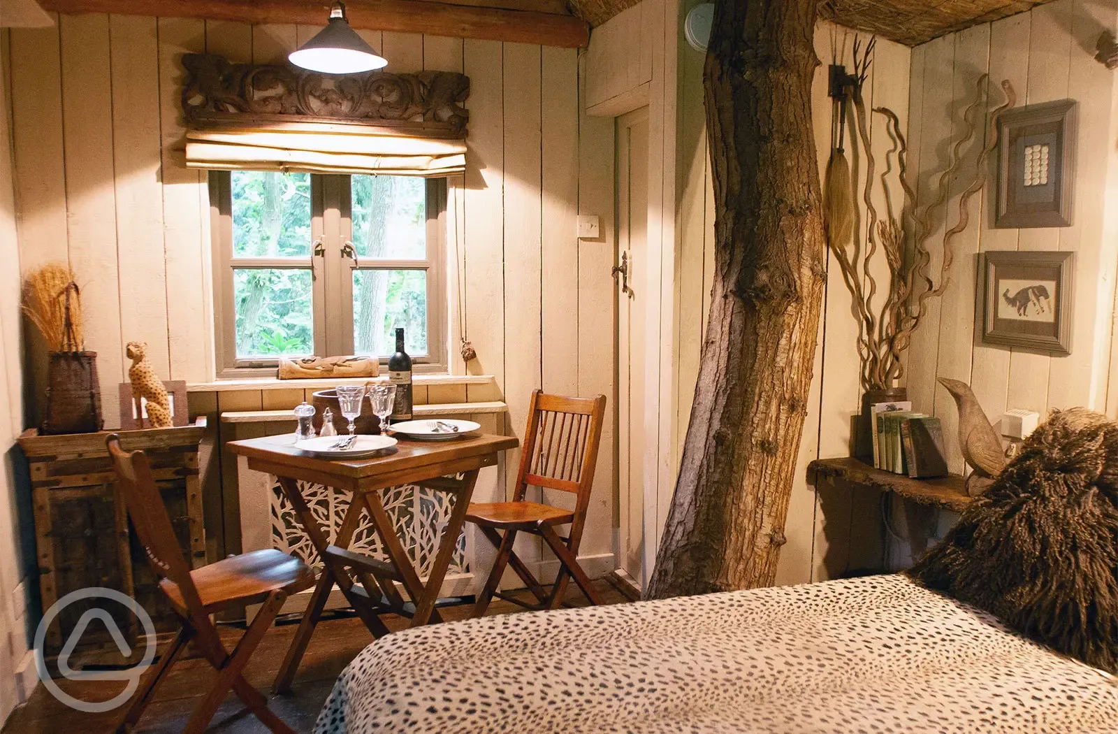 Set in a sweet chestnut bordering a wood, this is a comfy space for two with thatched roof, double bed set between the tree branches and glass doors giving great views. There's an ensuite shower room and large balcony with swing seats.