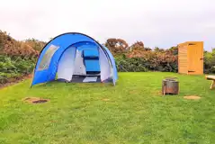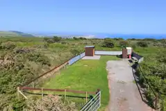 Enclosed electric hardstanding pitches equipped with a water hook up, private shower, compost toilet, and washing up area. There is also a cooking shelter, picnic table, and fire pit. Suitable for campervans, caravans, and motorhomes.