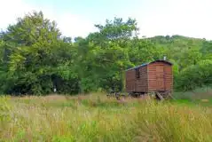 Separated from the main field by young trees, this cute shepherd's hut is perfect for singletons or couples. Inside is a proper double bed, wood stove, gas hob, solar lighting and breakfast bar. Outside is a private picnic bench.