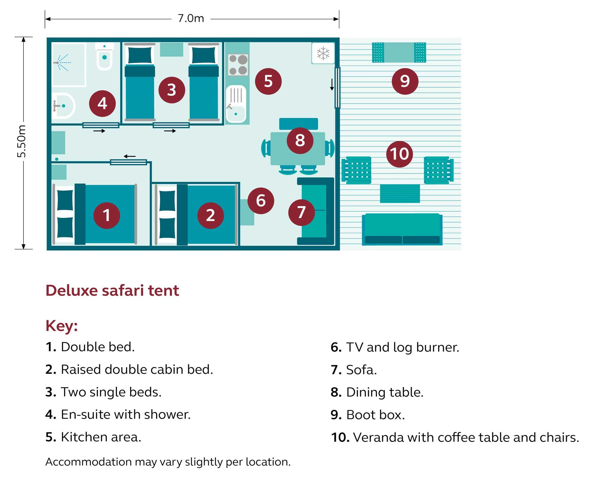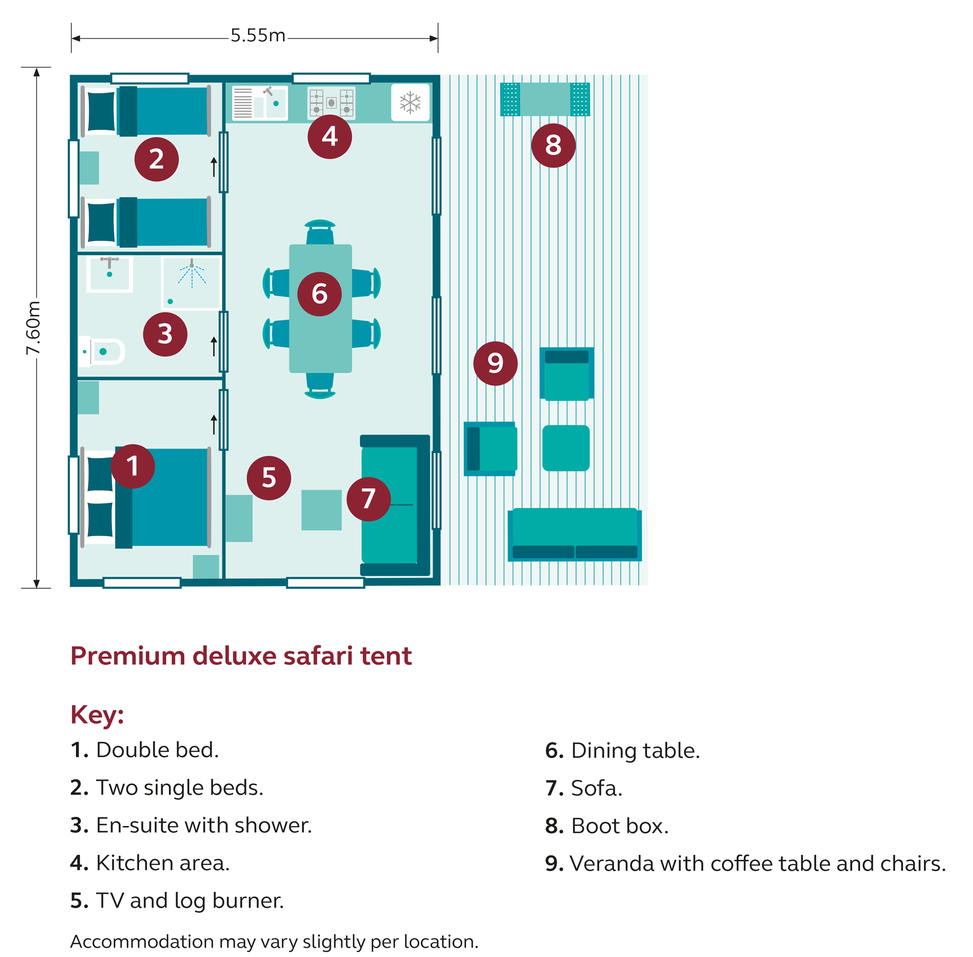 Safari tent with a double room, twin bedroom and bedding. Kitchen with a hob, toaster, fridge/freezer, kettle and microwave. Wood burner, WiFi, TV, dining area, sofa, ensuite (towels not included). Outdoor deck, coffee table and chairs. Pet free.