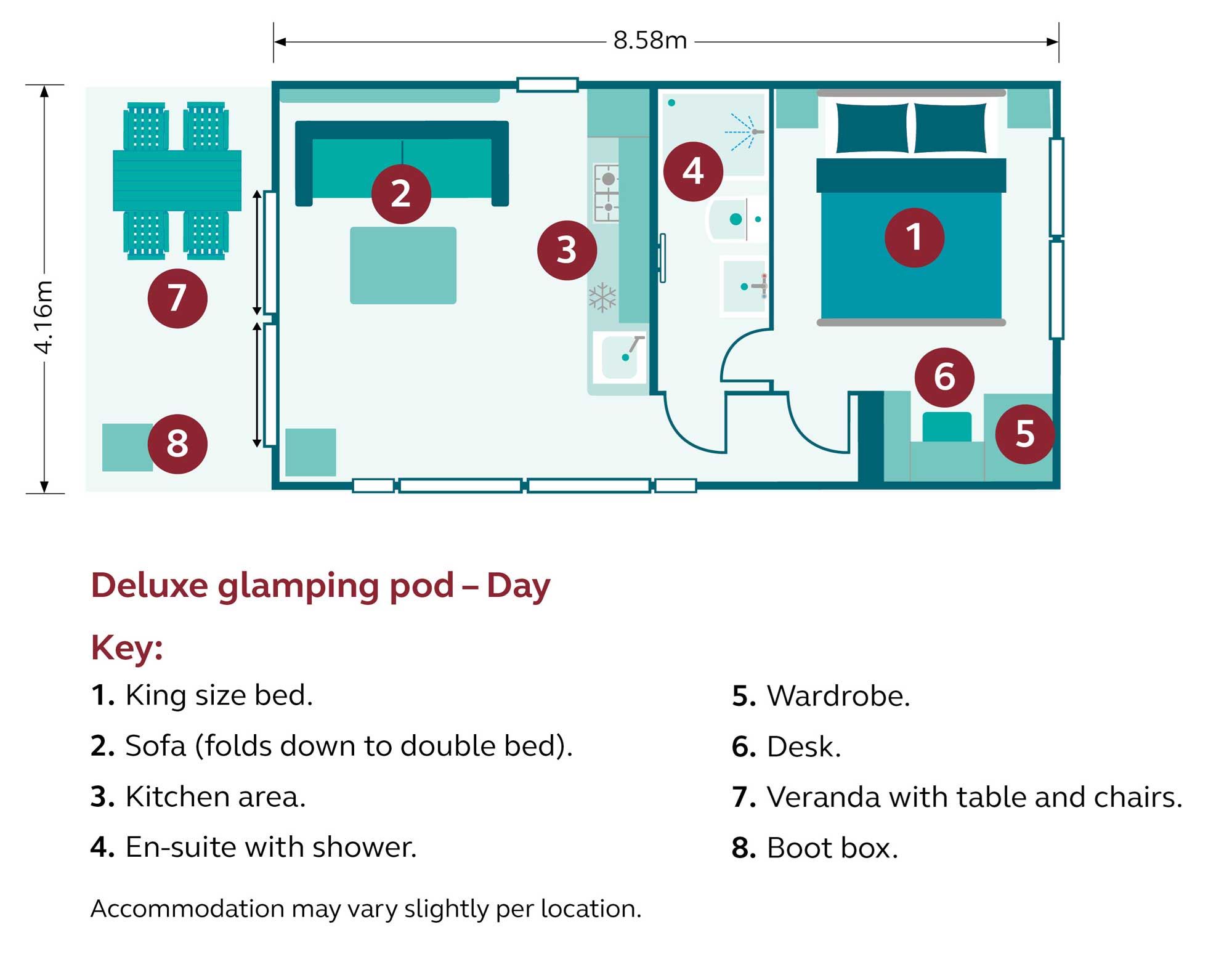 Pods with a double bedroom, double sofa bed and bedding. Equipped kitchen with an oven, hob, toaster, fridge, kettle and microwave. Includes heating, WiFi, a dining area and TV. Ensuite bathroom (towels not included). Outdoor deck and furniture. Pet free.