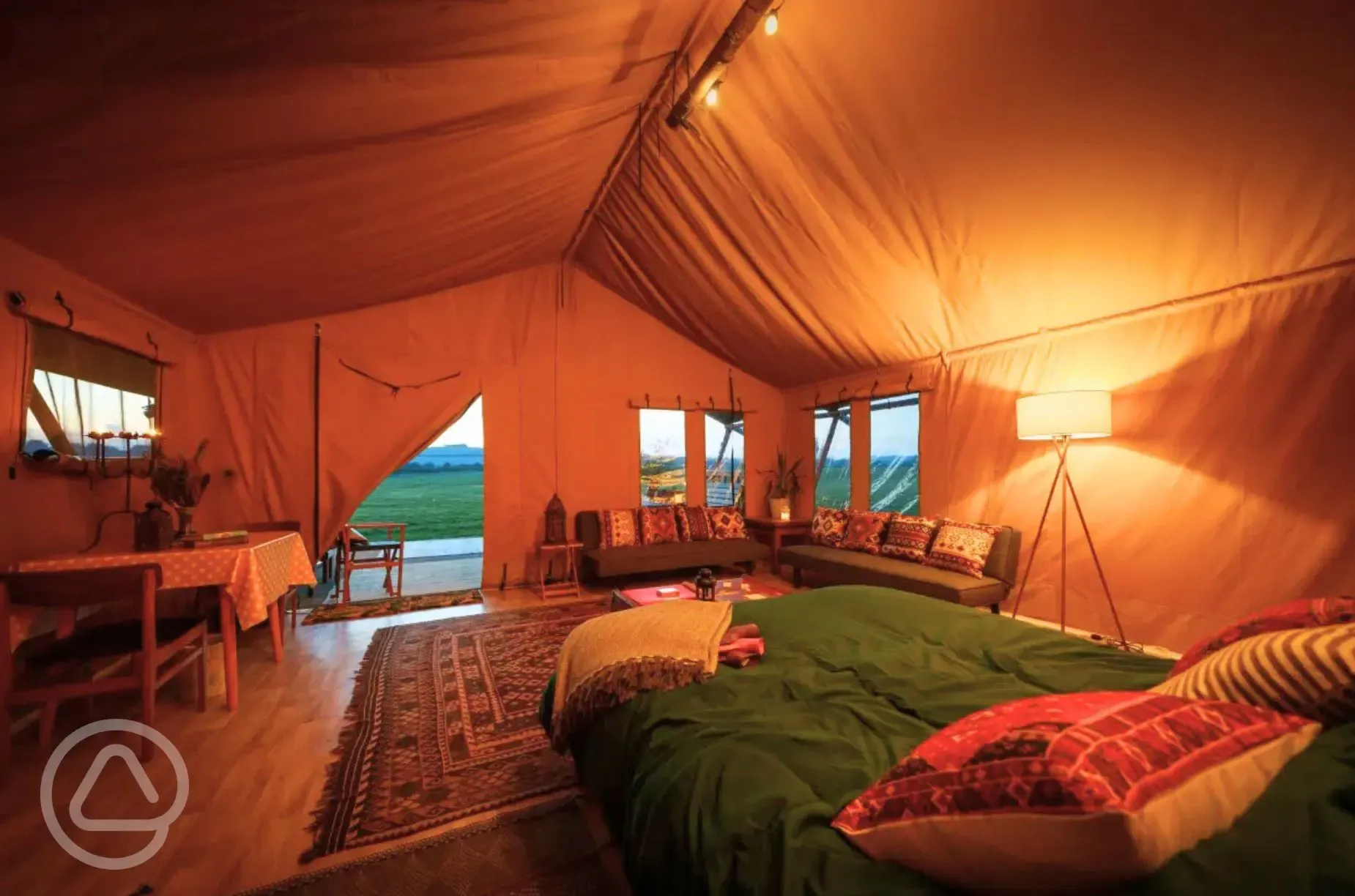 Beautifully furnished tough canvas bell tents that each sleep up to 4 people. They are 5m in diamteter with a double bed inside and two futons.