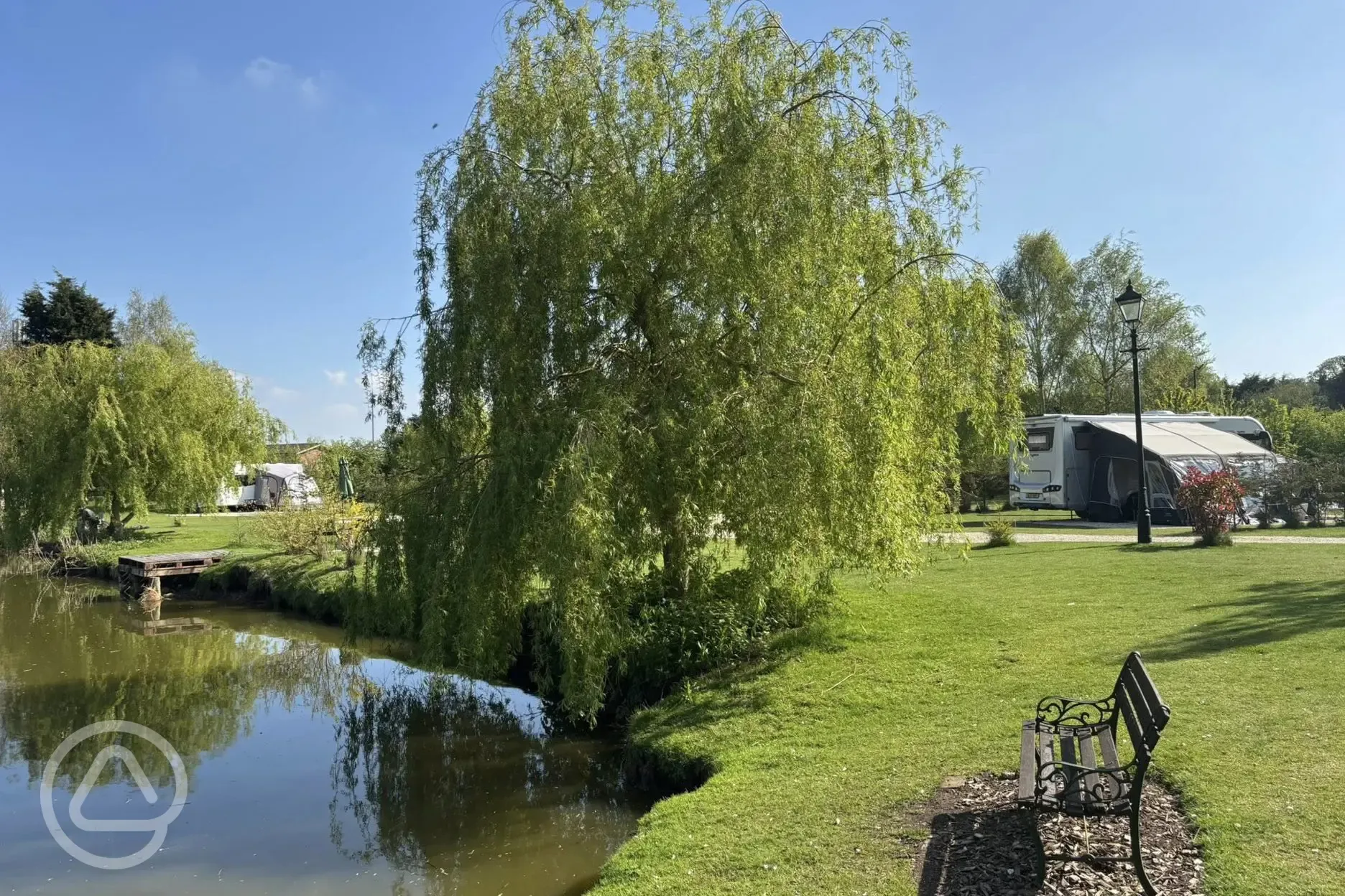 This peaceful location is an ideal adult only escape. The site is extremely picturesque with beautiful landscaping and a willow-lined large fishing pond, you can't help but sit back and enjoy your surroundings. It is a small site with just eleven electric hardstanding pitches, making it always nice and peaceful. The gravel pitches each have a 16 amp electric hook up and allow both caravans and motorhomes. Enjoy being surrounded by wildlife and idyllic countryside. Relax by the carp-filled pond, or take a stroll around the grounds and over the charming bridges. You can also expect visits from animals such as ducks, geese, rabbits and much more! The site is located just ten minutes from the Humber and there are cafes, pubs and restaurants all within a 30 minute walk from the site. For keen cyclists, The Yorkshire Wolds and The Way of the Roses cycle routes are also on your doorstep. West End cafe and Kaze cafe in the village are a great local attraction. Dogs are welcome.