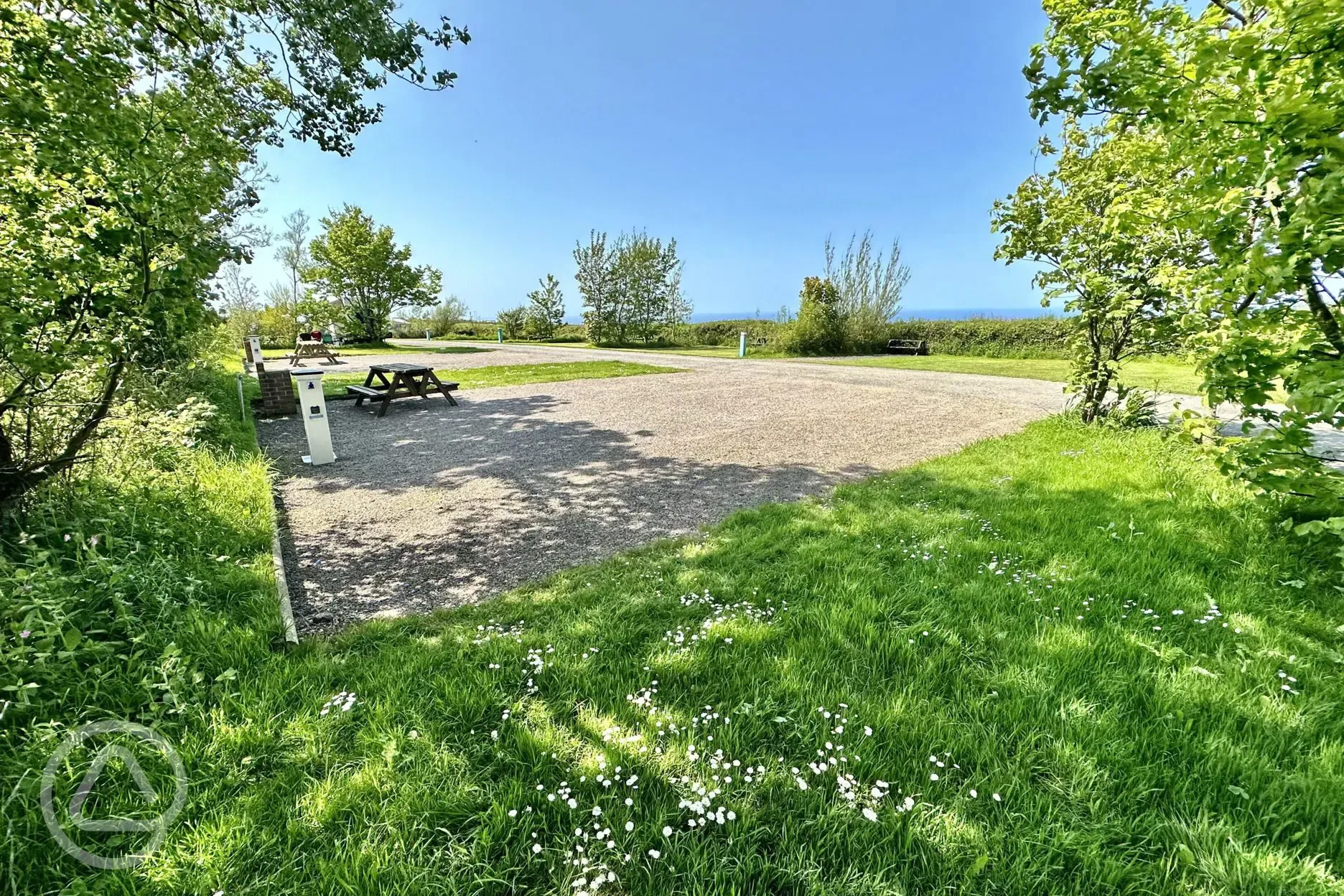 Grass pitches with electric and views of the coast and Bristol Channel.