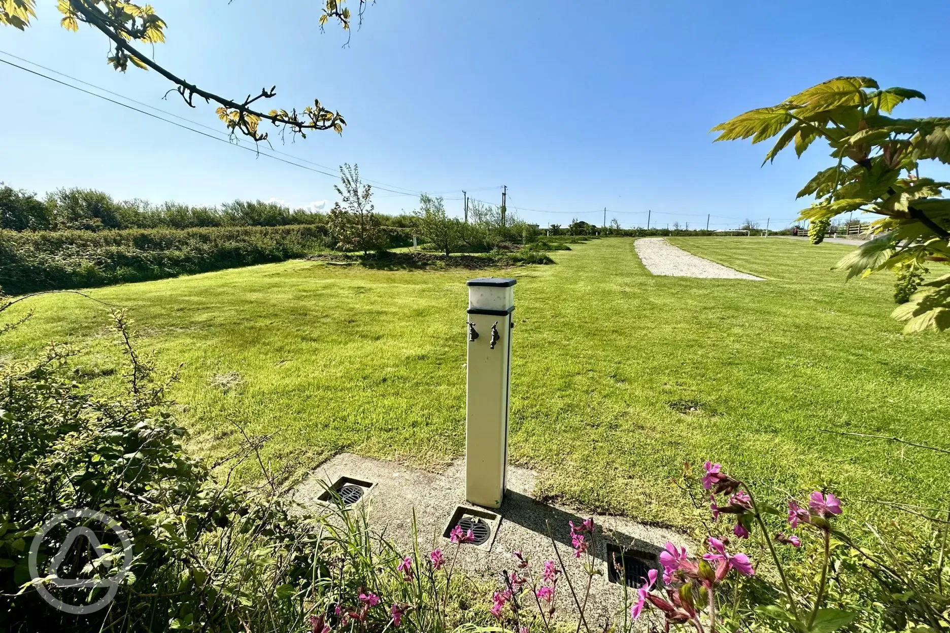 Pitches on grass with electric, water and a grey water drain, to suit tents and tourers.