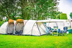 Flat grass pitches without electric, measuring 6m x 5m. There's easy access, and it's a two minute walk through well lit woods to the main site shower block.