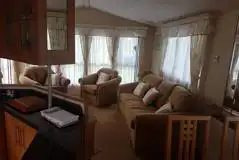 The static caravan comprises a double ensuite room, bunk bed room, and a double sofa bed in the spacious living area. There is also a fully-equipped kitchen, and dining table. Tea and coffee, cooking utensils, bedding, and towels are all provided.
