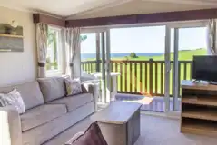 A modern caravan that sleeps between four and six people. There is a fully equipped kitchen, dining area and living area. They have a private decking area and outdoor seating. Some caravans come with a private hot tub, and some are pet friendly.