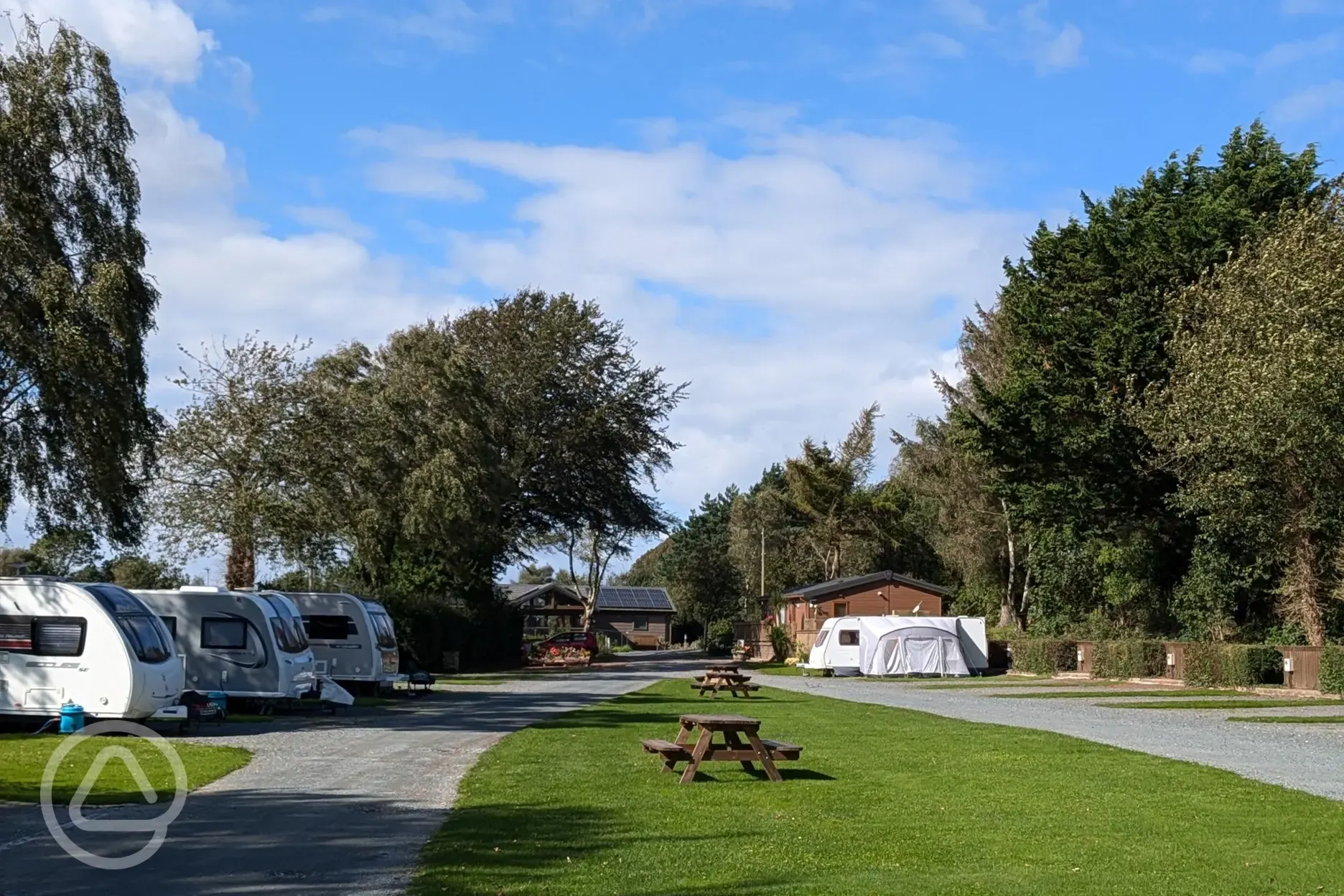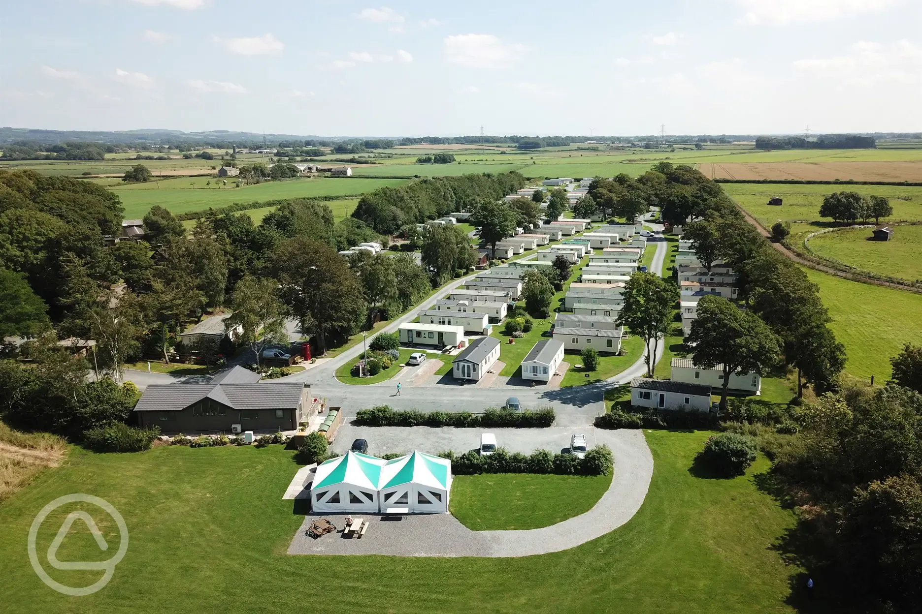 This is a beautifully well kept park in an ideal location, conveniently just 15 minutes drive from junction 33 of the M6. The park is surrounded by beautiful countryside just on the edge of the Forest of Bowland AONB to one side, and the coastal plain to the other. Just a short hop from the historic city of Lancaster, it isn't much further to get to Preston to the South or the Lake District to the North. The park is meticulously maintained and is a family-run business. It's great for families with a park and open field for the young ones to play and tire themselves out in. This is a quiet relaxing holiday location for couples and friends of all ages, with a host of rural activities in the area. Dogs are very welcome - the park was national runners-up in the 2018 Dog Friendly Awards! On site there are 31 hardstanding pitches for caravans and motorhomes, with electric and water provided. Seasonal pitches are also available for long term stays.