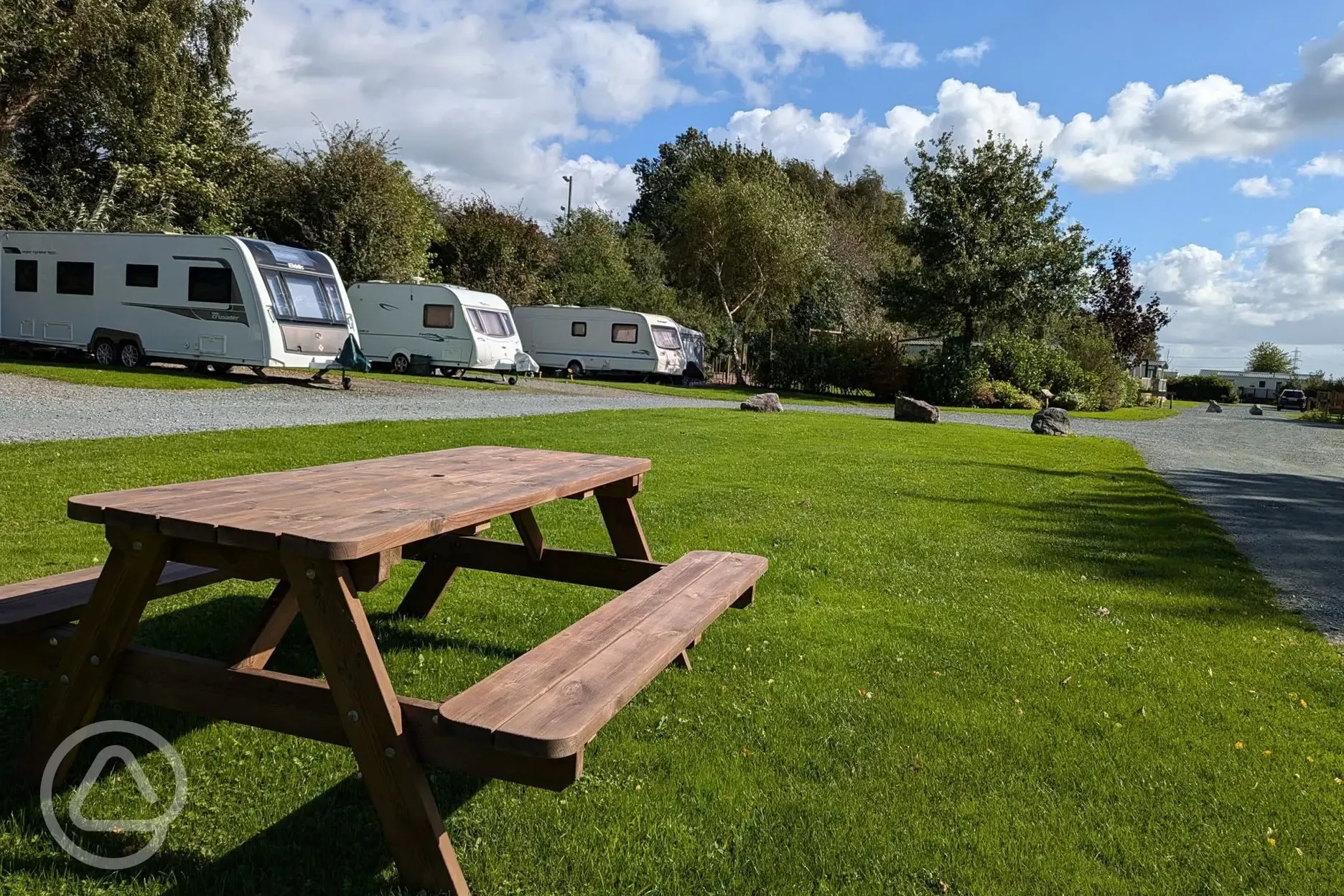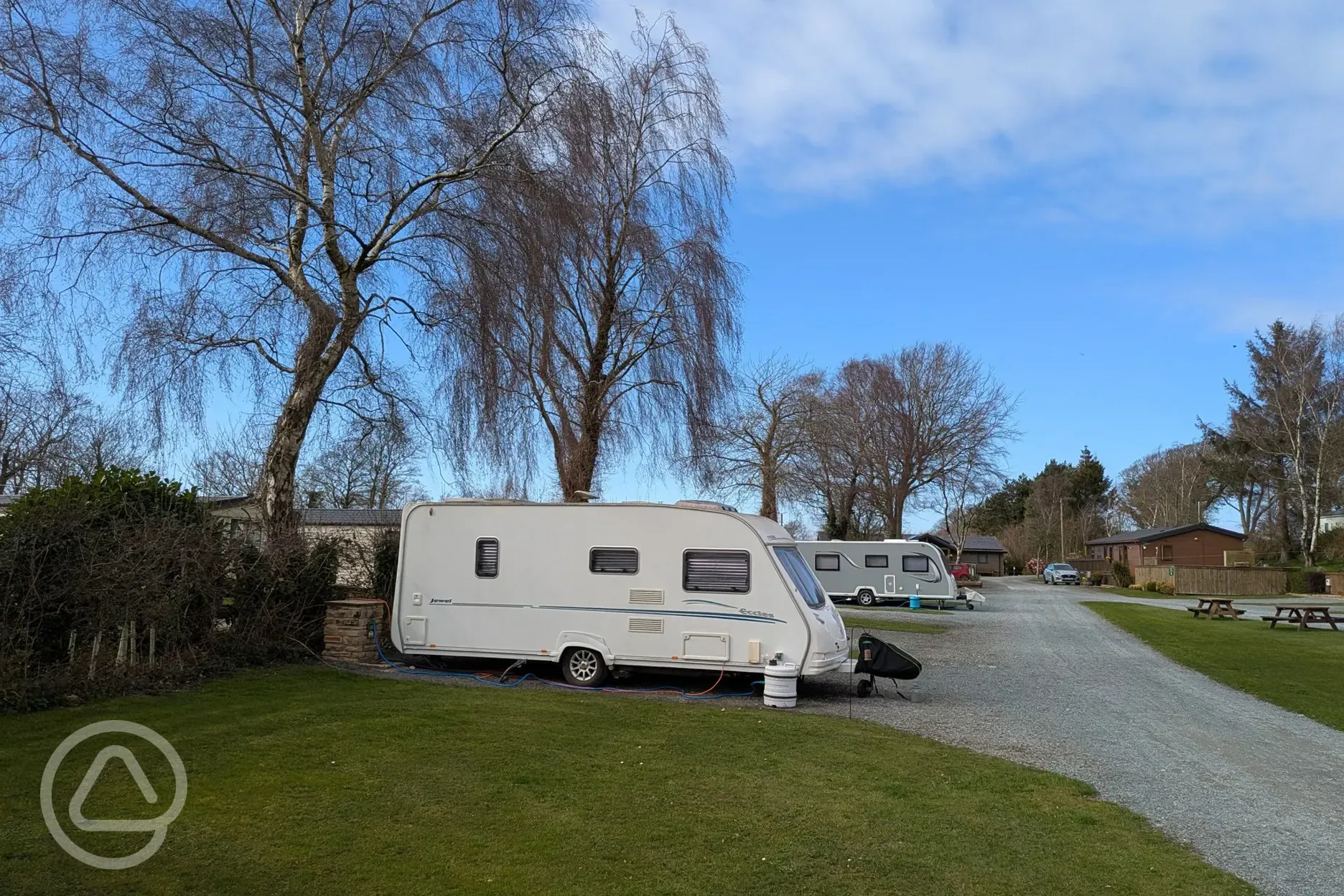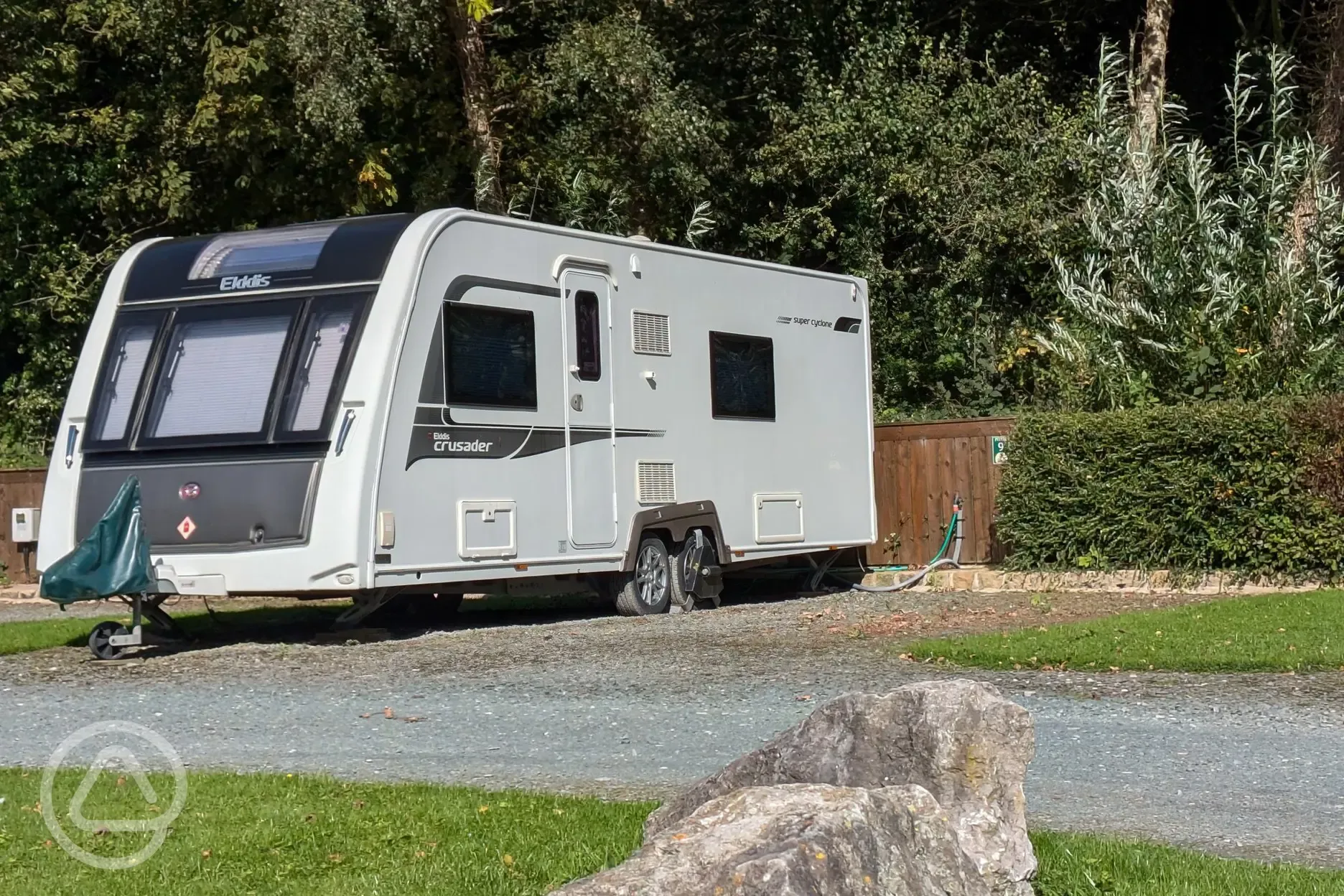 All hardstanding with access to an electric hook-up and water. No tents, sorry.