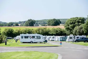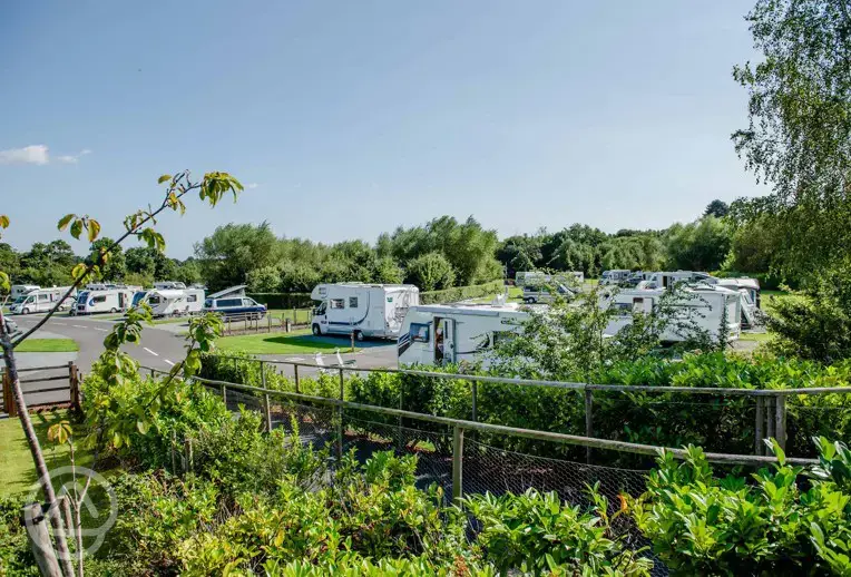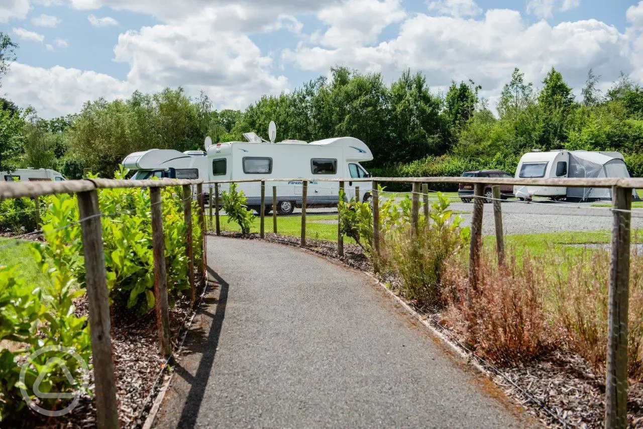 Hardstanding pitches catering for tourers and serviced with 16-Amp electric, water and grey waste disposal.