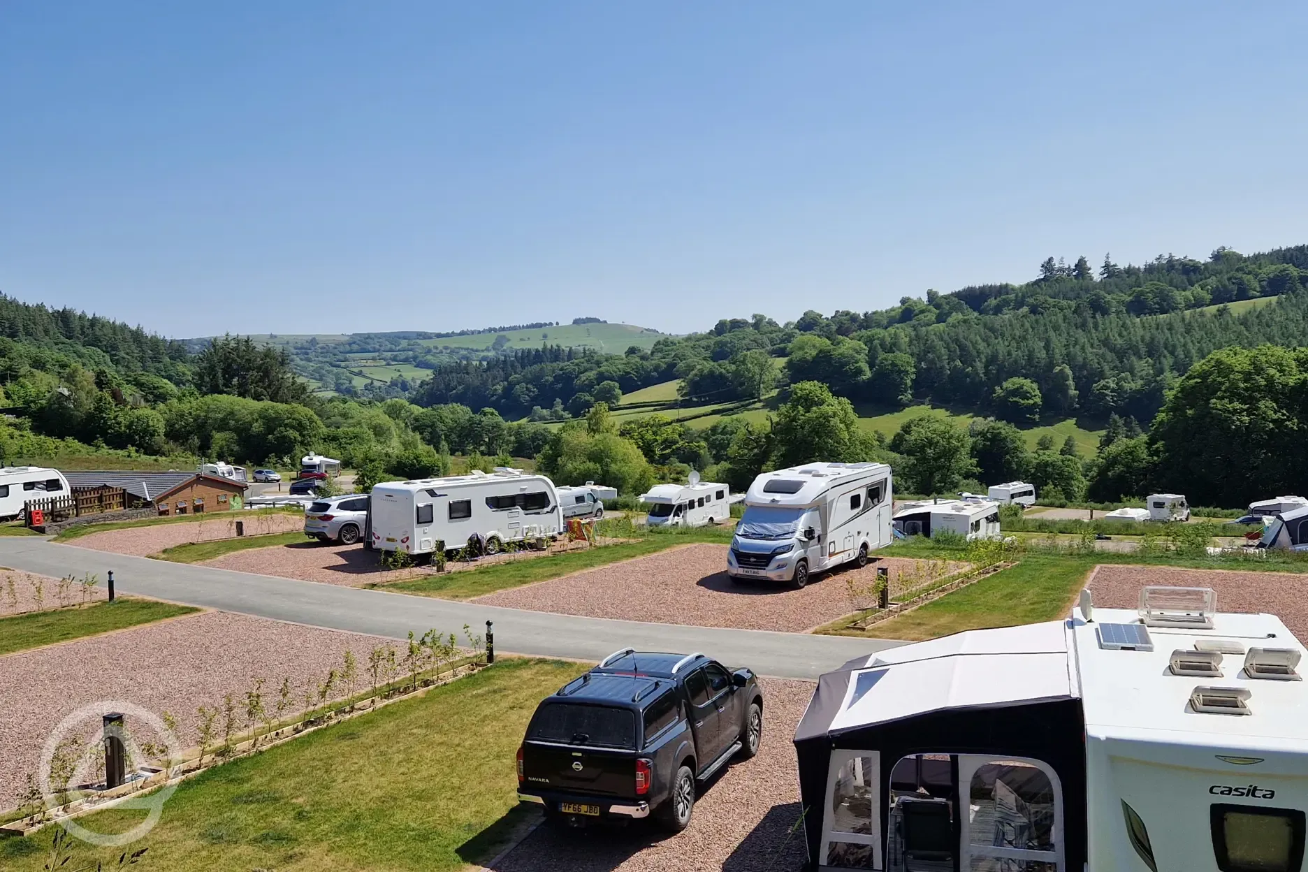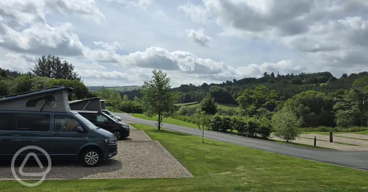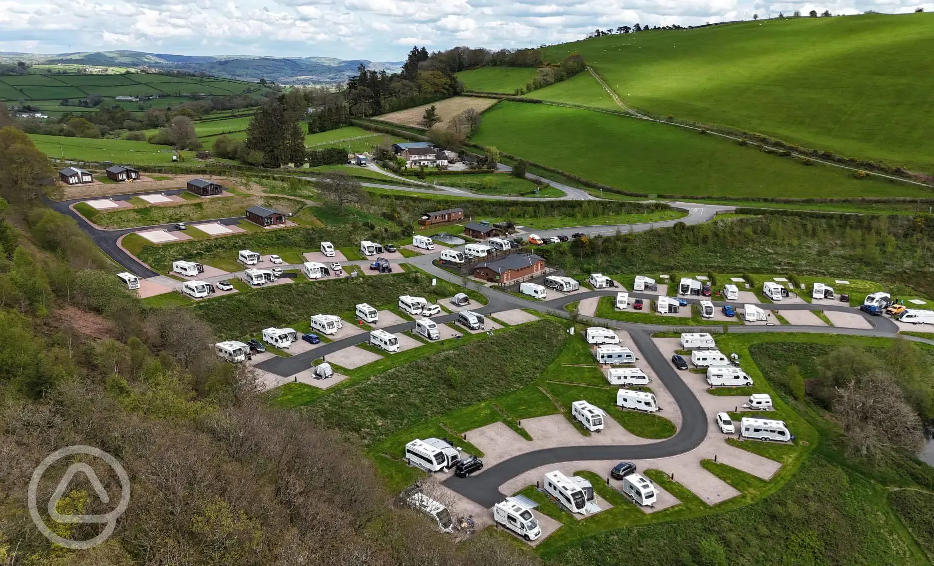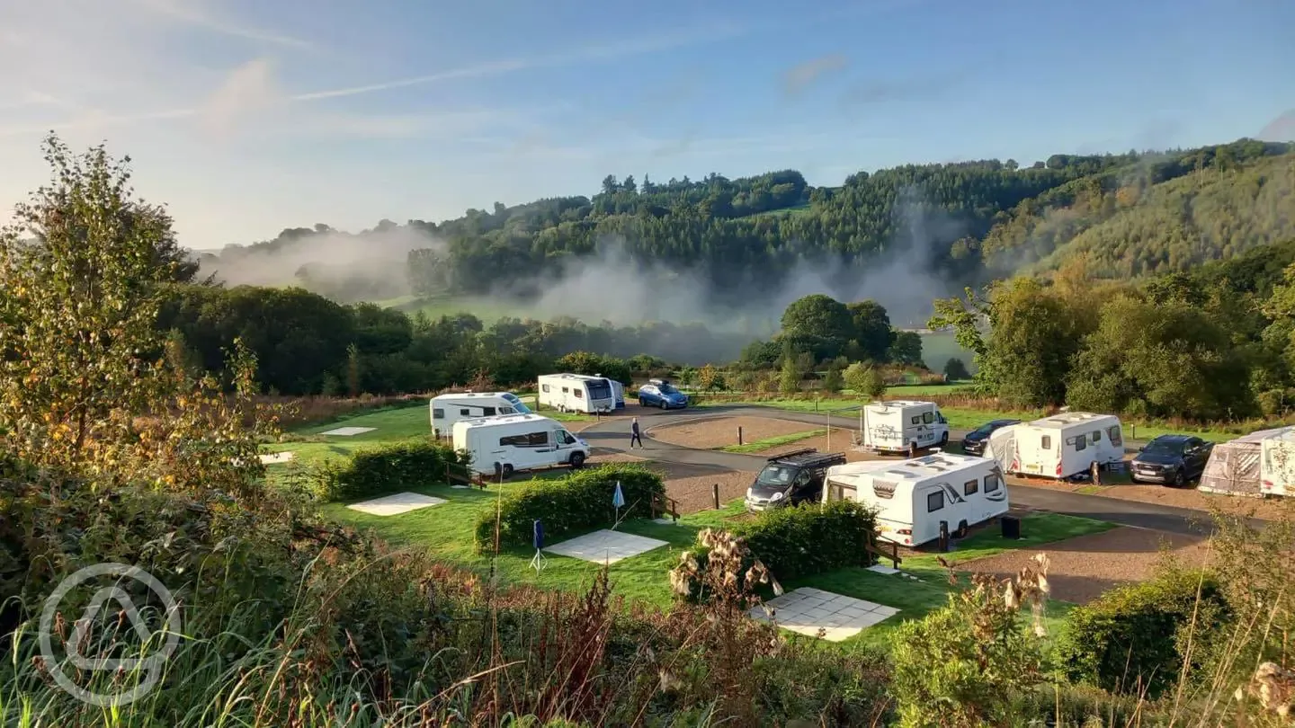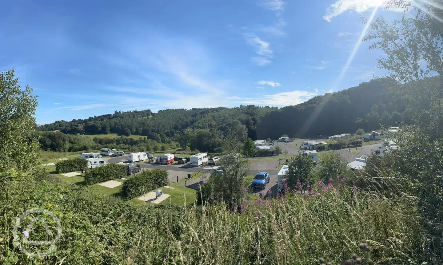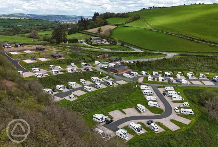 This is a five star family run touring park for adults only. You'll be pitched up among 20 acres of lush greenery including ponds, a coarse fishing lake, walking routes and dog walks. The ideal location to find peace and tranquillity with breathtaking views across the Welsh Valley. Unwind in nature and enjoy all that the surrounding countryside and wildlife has to offer. Choose from 62 fully serviced pitches, including ten Premium fully serviced pitches which feature extra large hardstandings and faster WiFi speeds. Enjoy the use of a state of the art amenity block (winners of loo of the year). All pitches are fully serviced with 16 amp electricity, grey and brown waste water, and fresh water with complimentary WiFi. 7kWh of electric is inclusive of nightly pitch fees, usage above this is metered with unused balance refunded to you upon departure. Fires and fire pits are not allowed, sorry. However, you are welcome to use your own charcoal, gas or electric BBQs but these must be located on the gravel pitch area and supervised at all times. Dogs are welcome, within the grounds of the park there are large dog walking areas, with a separate fenced off dog training area.