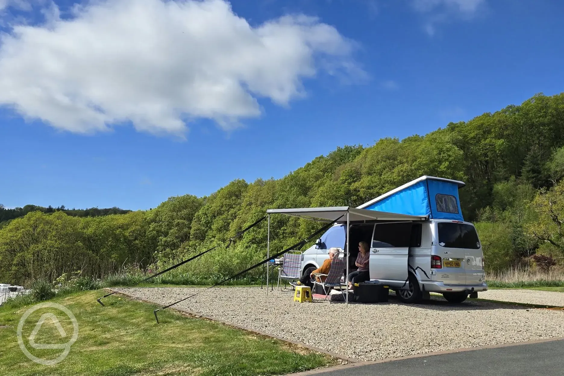 This pitch is ideal for a campervan or small motorhome without an awning. You may fit a small caravan on this pitch providing you are happy to park your towing vehicle on the reception parking area.