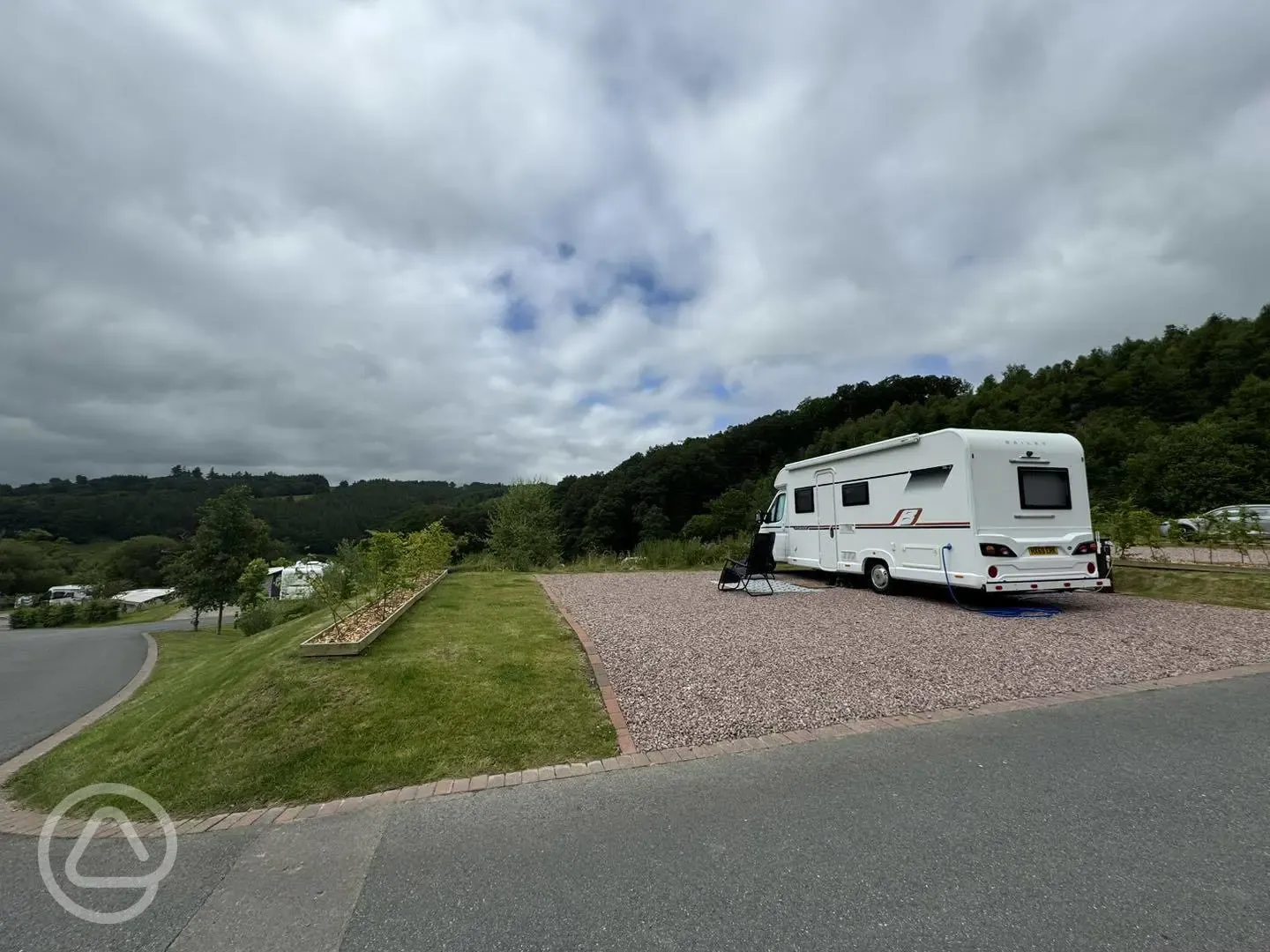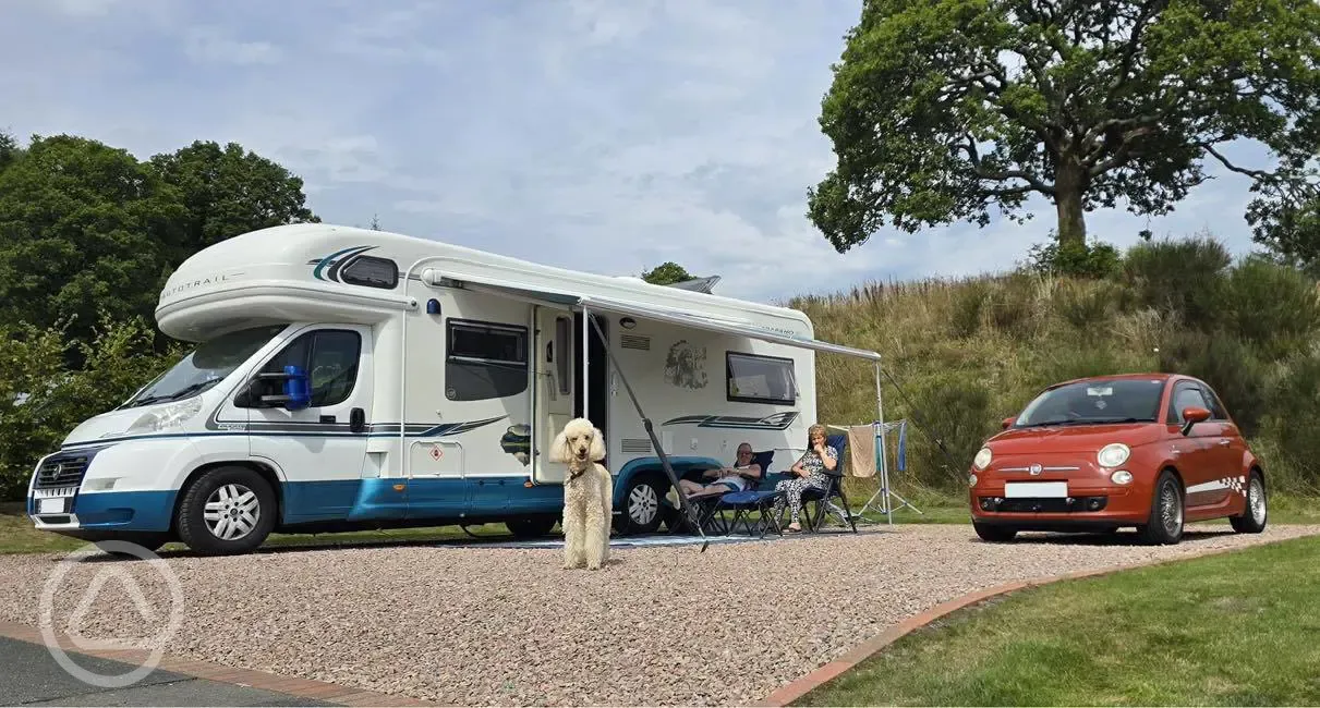 Premium pitches include extra large gravel hardstanding with superfast WiFi and are accessed along tarmac roadways and paths. All pitches have grey and brown waste water disposal, fresh water and electric hook up and piped TV.