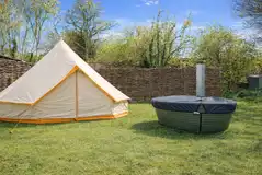 Spacious grass pitch with a private wood fired hot tub and an optional metered 16 amp electric hookup. Suitable for tents, trailer tents, campervans and motorhomes.