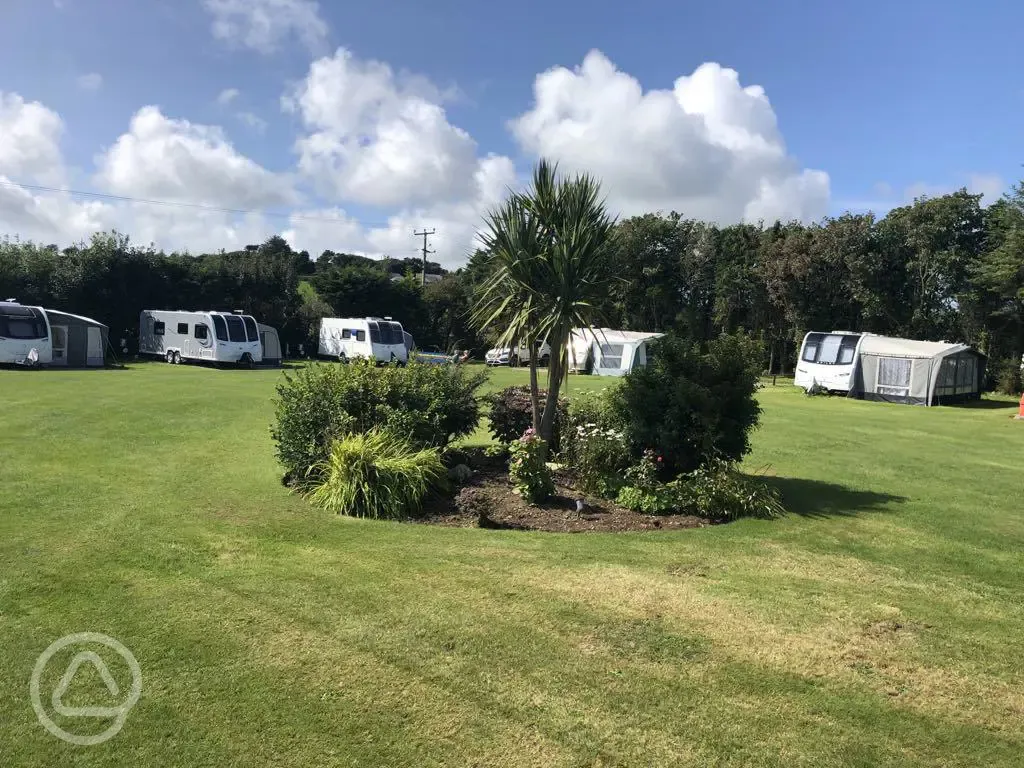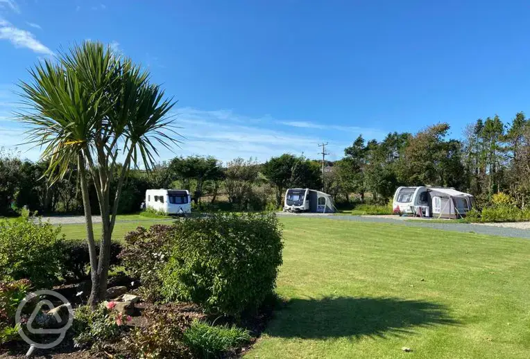 Grass pitches for tourers with water and metered electric on the pitch with beautiful views over the mountains and sea.