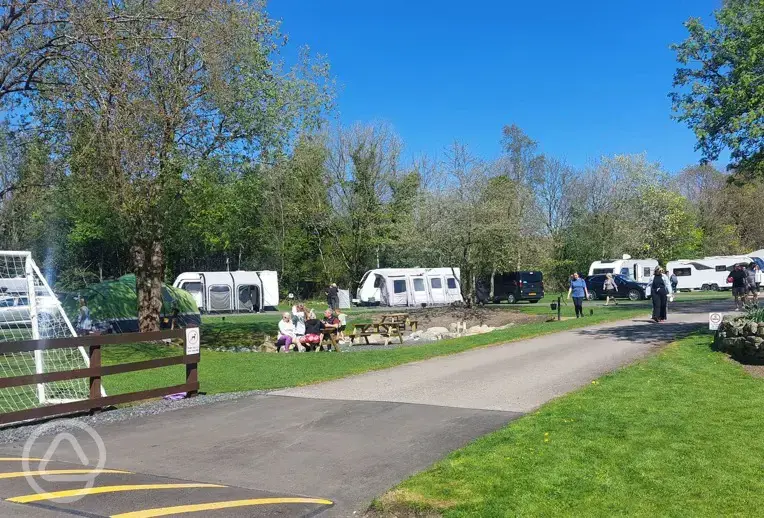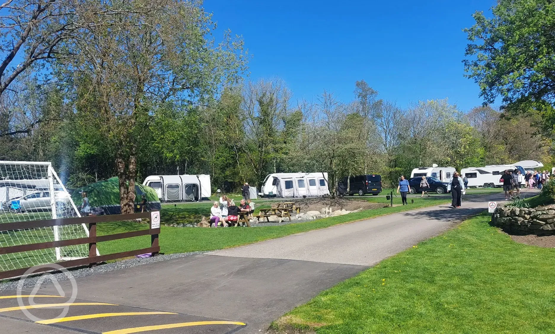 Spacious hardstanding pitches for touring, including electric hookup and nearby water taps and grey waste drains.