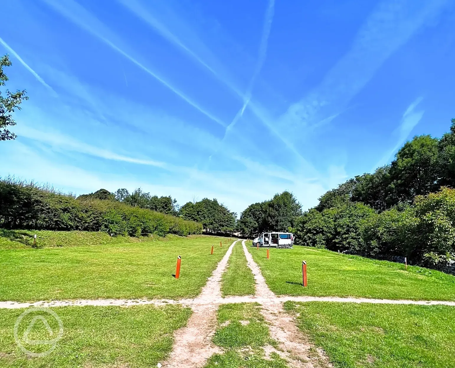 Grass pitches measuring 6m x 8m catering for tents and small campervans only. Please note that campervans must not exceed 5.3m in length.