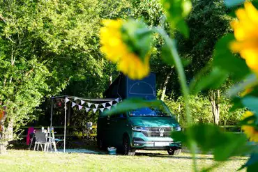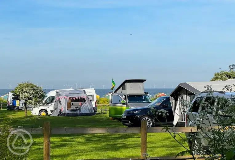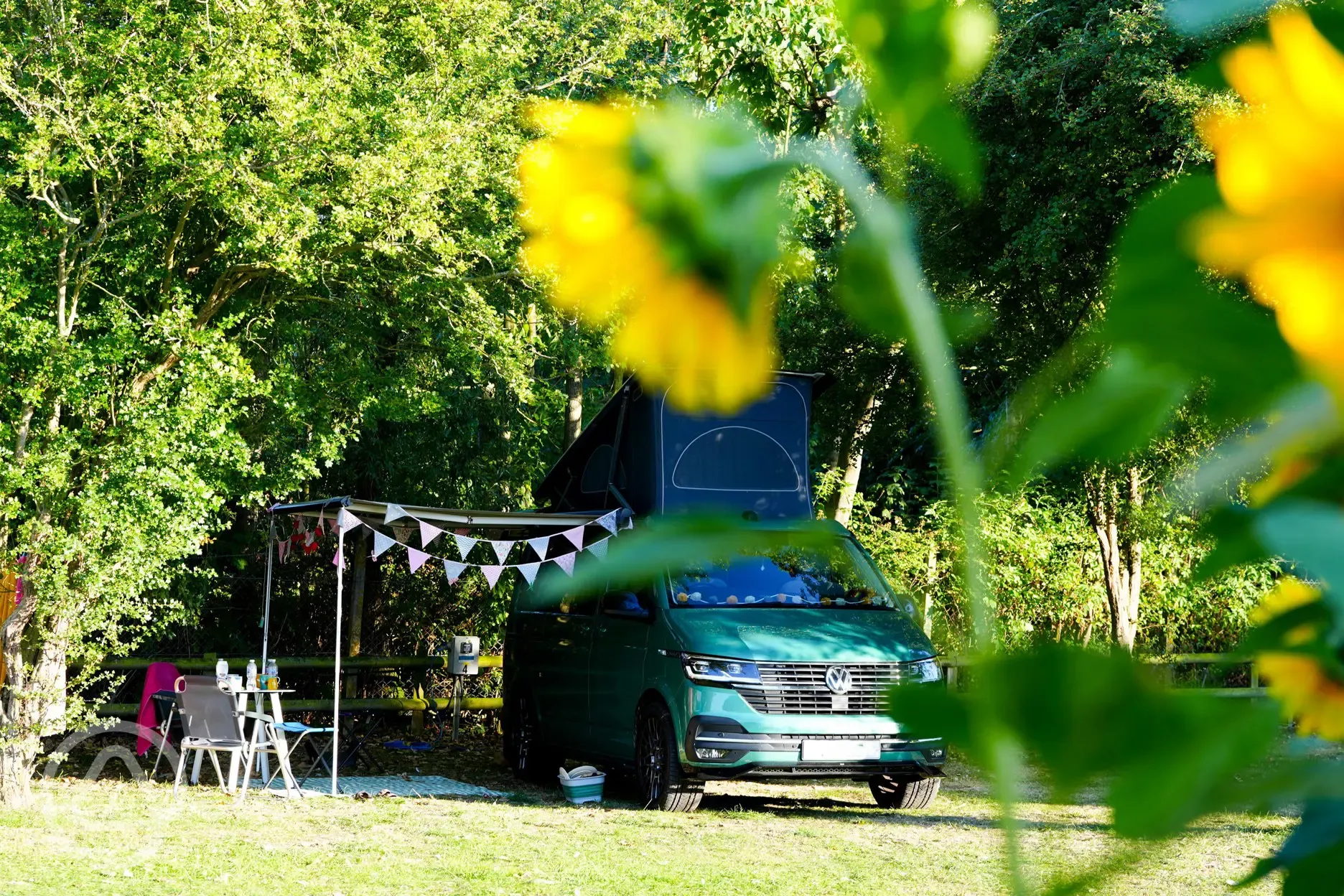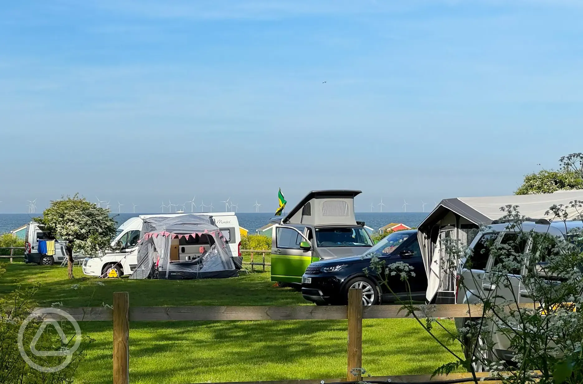 Electric grass pitches with 10 amp electric hook up, suitable for tents and touring vehicles. Dog friendly.