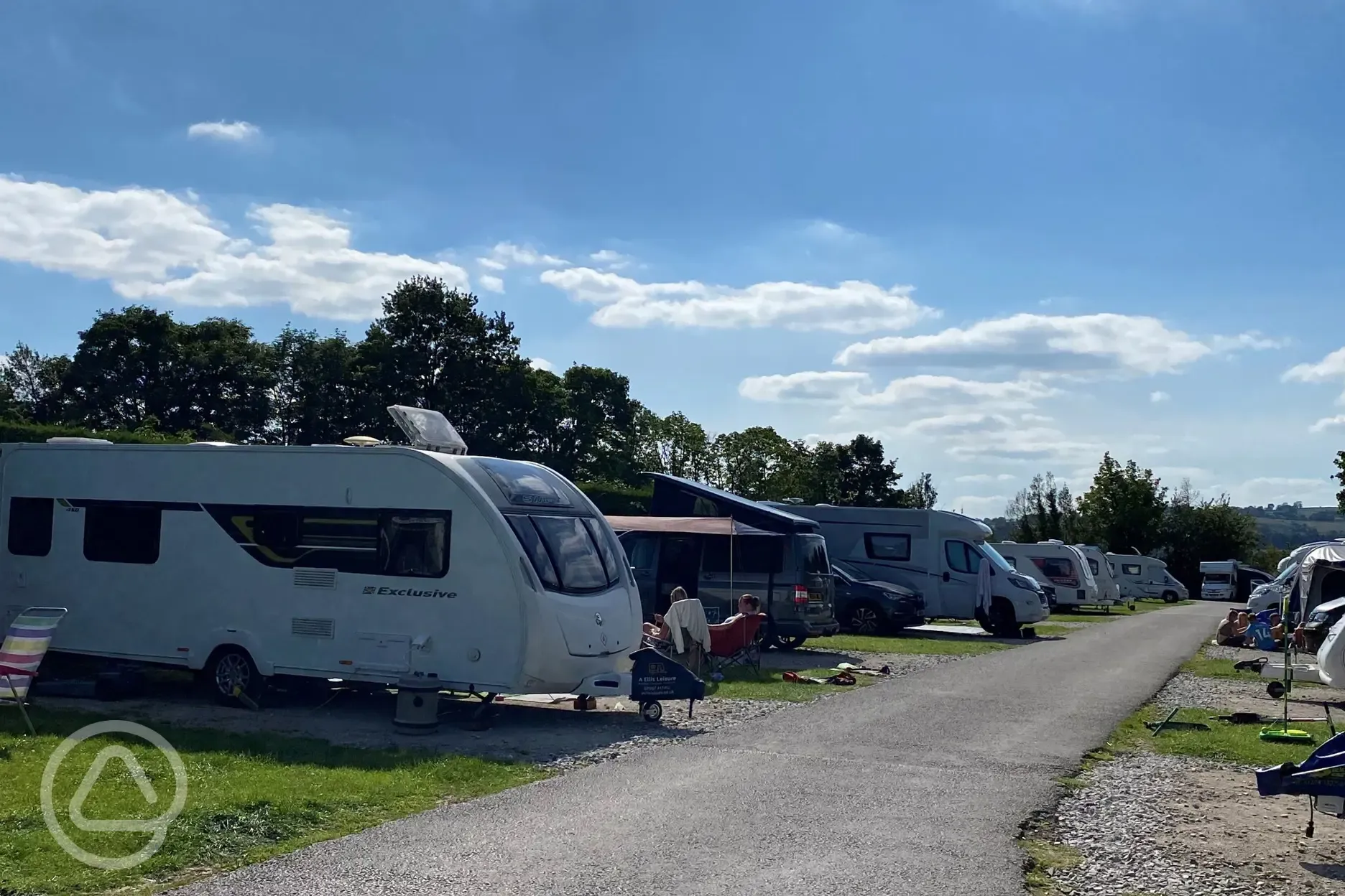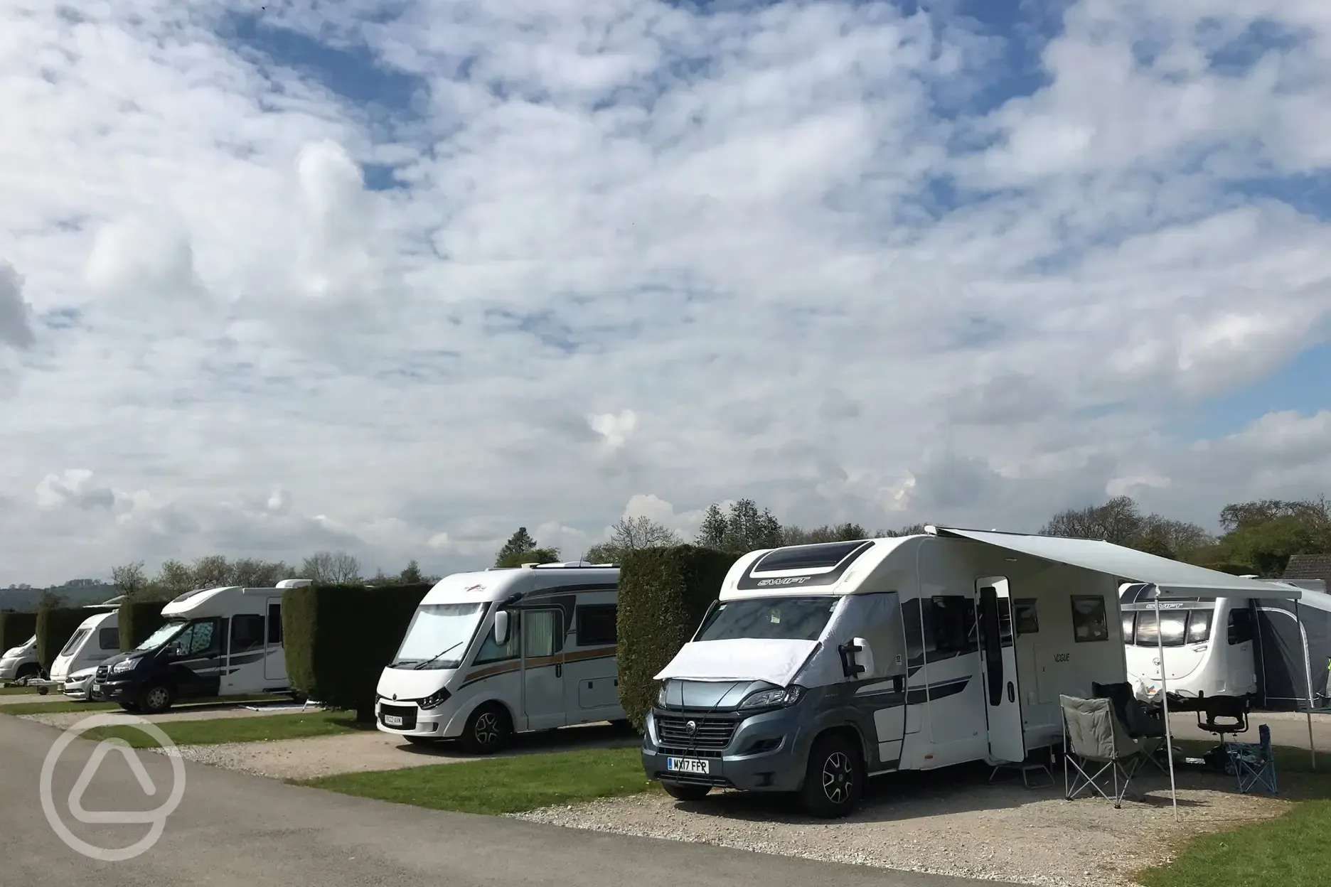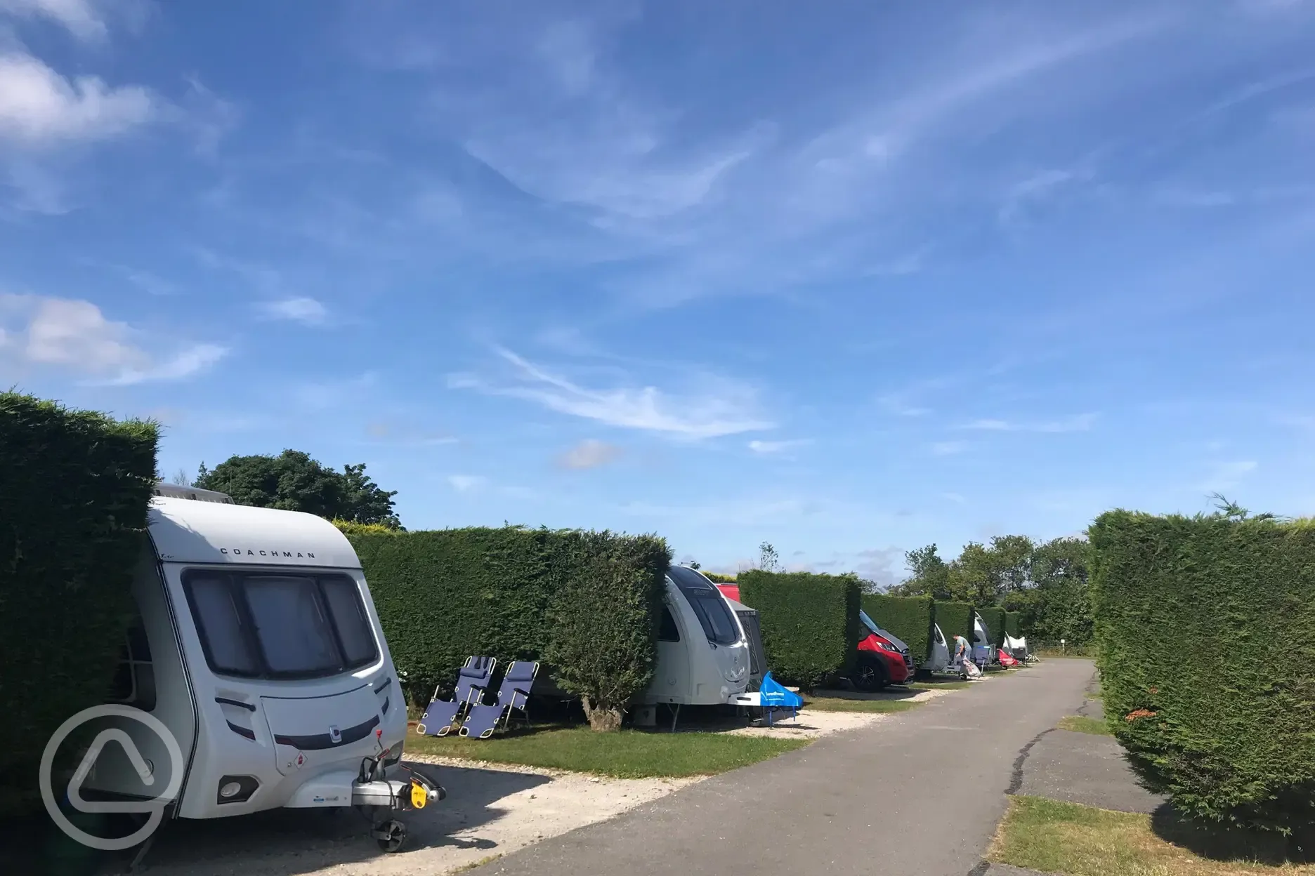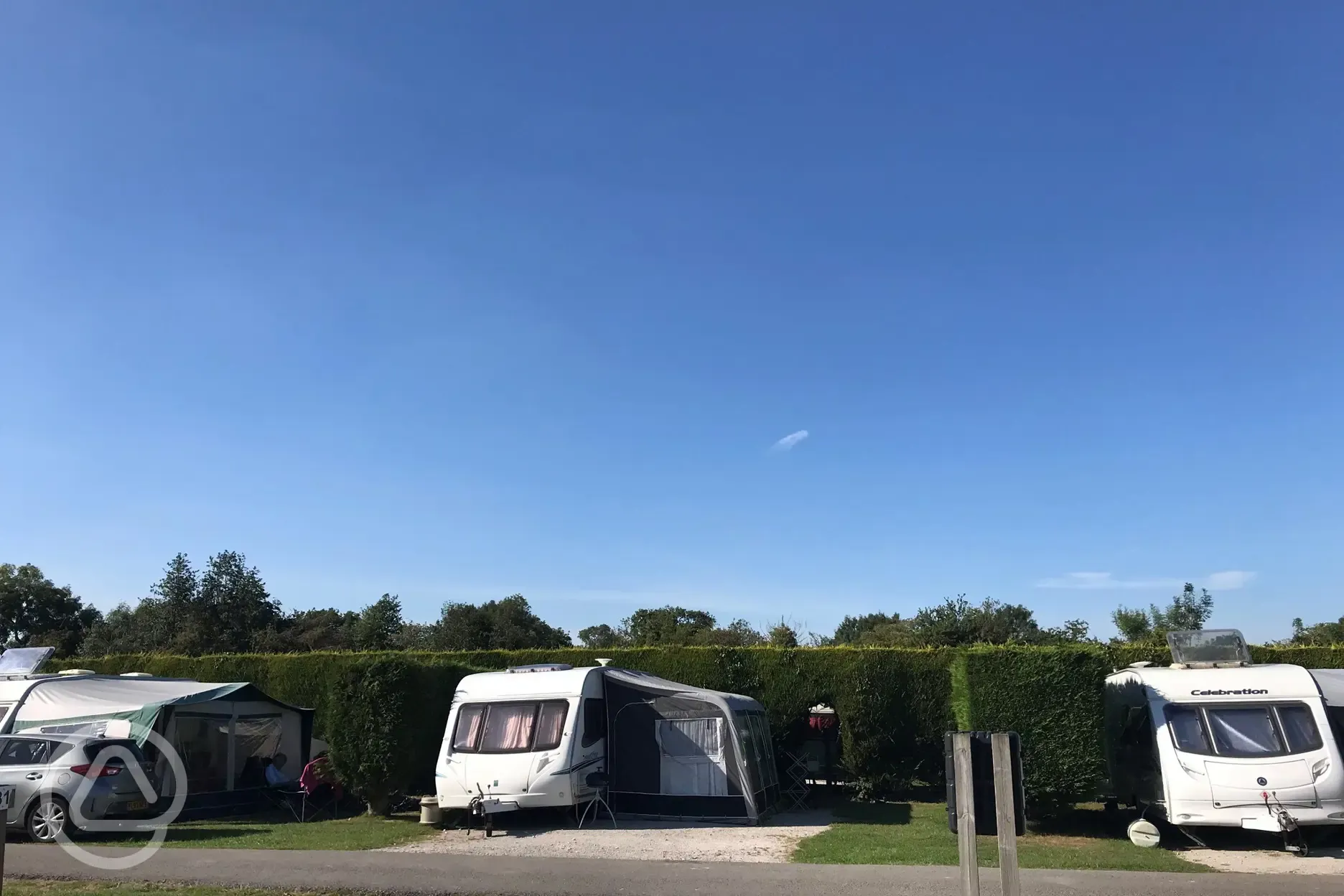 Hardstanding pitches with a small grass area to peg the edge of an awning into. You may need rock pegs. Maximum occupancy per pitch is one family (two parents and their children) or two couples.