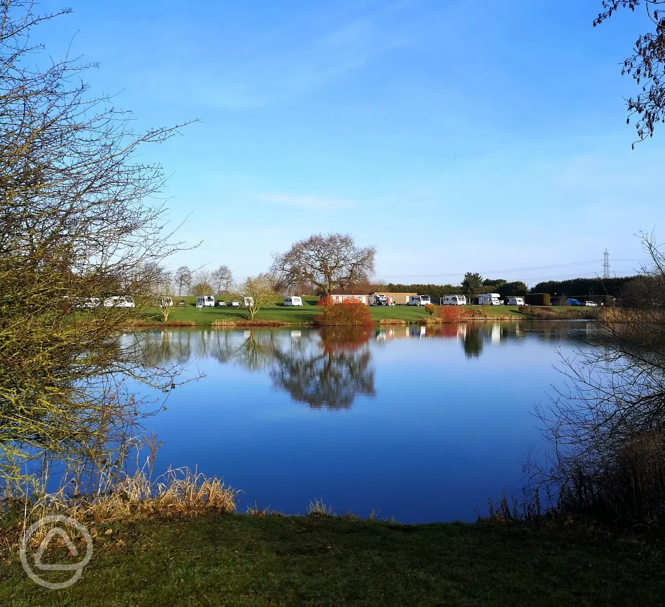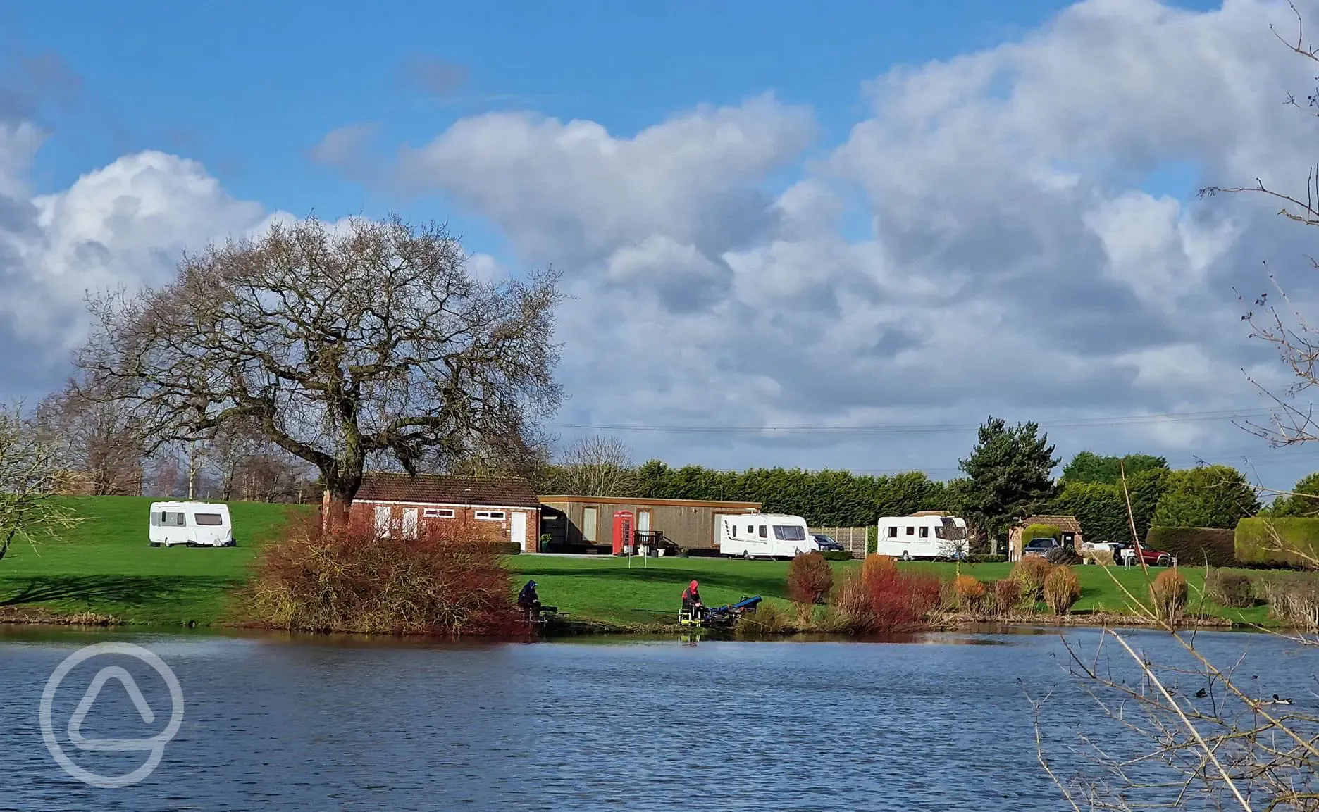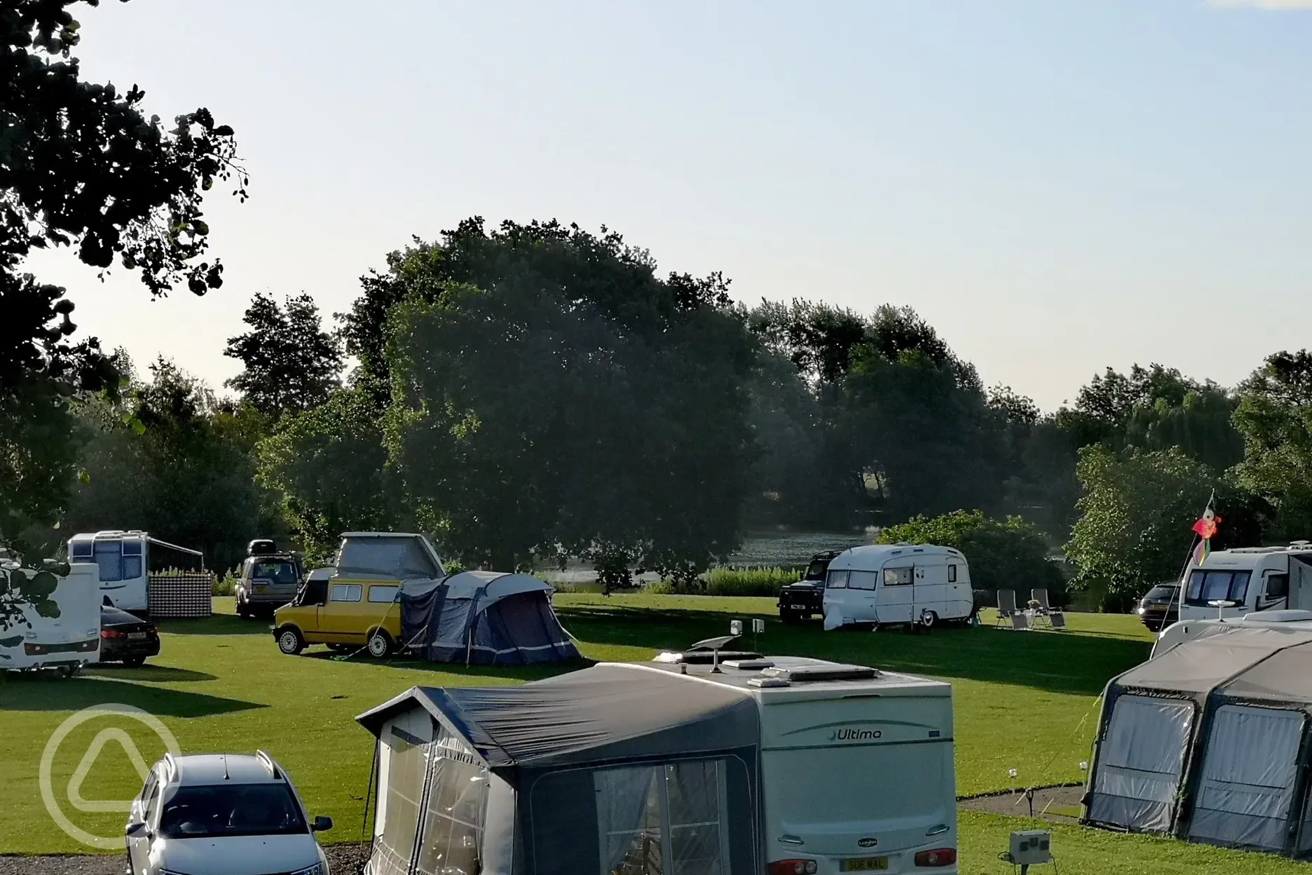 Grass pitches with optional electric available for tents, caravans and motorhomes overlooking the lake.