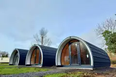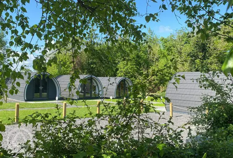 Glamping pods equipped with a double bed, folding sofa bed, TV, kitchenette, tableware and ensuite. Outside is space for muddy shoes. Included is a welcome pack, access to the pool and leisure suite, and a small breakfast bag each morning.