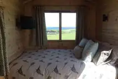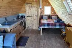 A wooden glamping pod with a double bed, double sofa bed, free Wifi, a fire-pit, an ensuite bathroom and kitchenette.