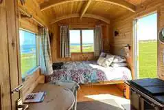 A shepherd's hut furnished with a king-sized bed, kitchenette, ensuite bathroom, a log burning cooking stove and a private fire pit.