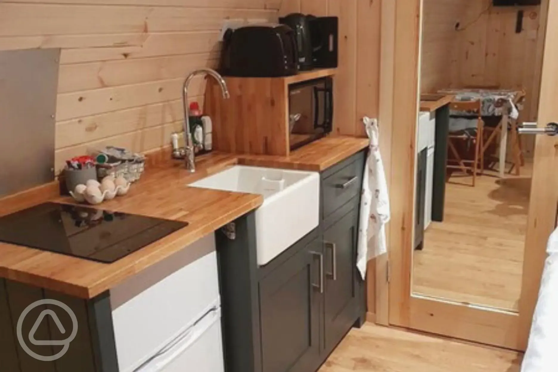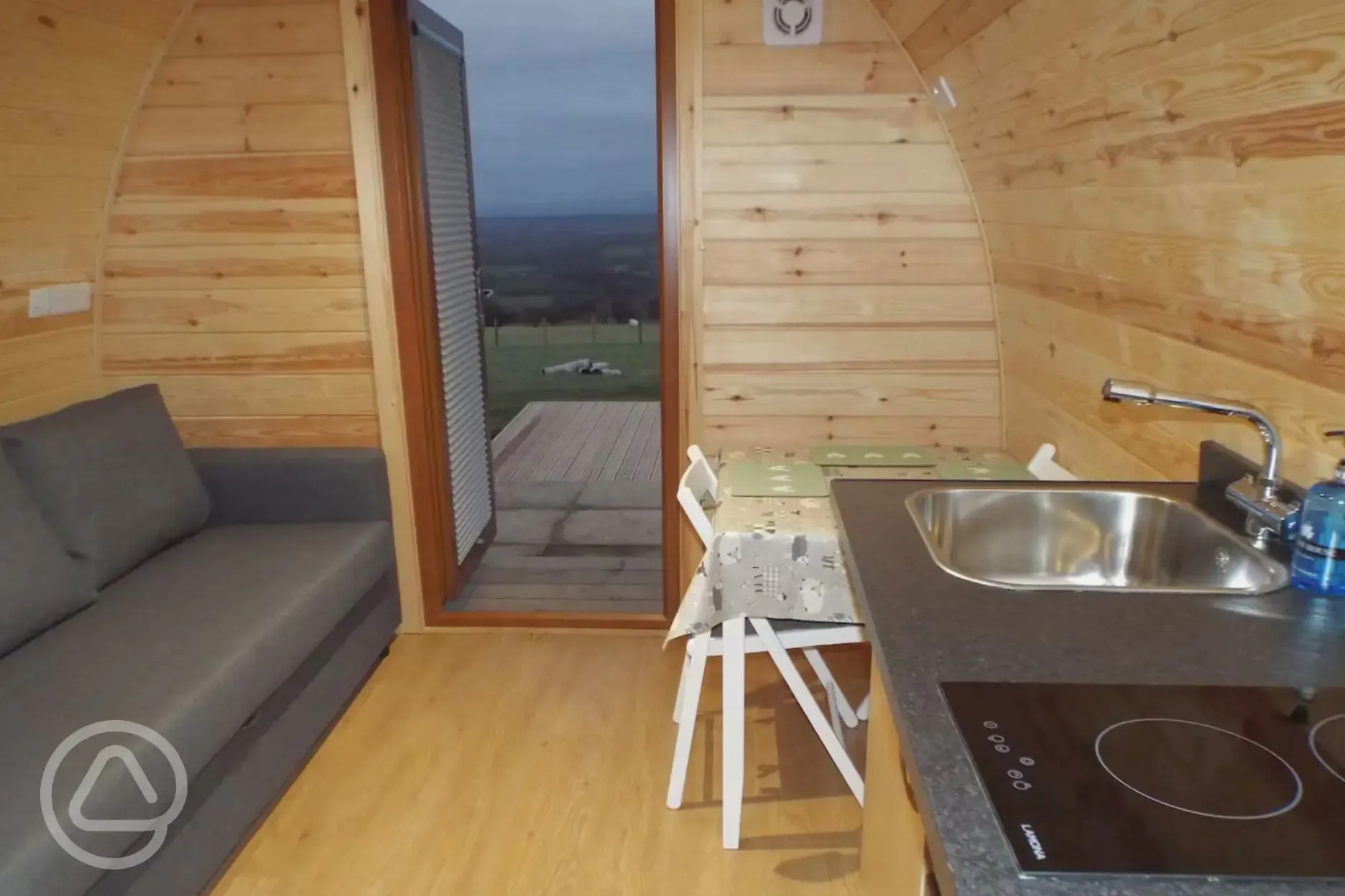 Featuring a double bed and a king size sofa bed, the pod also includes underfloor heating, ensuite toilet and larger shower, plus a TV. Inside is a hob, microwave, fridge freezer, toaster and kettle. Large deck for BBQs. Access to hot tub too.