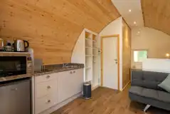 Cosy ensuite pods with an open plan living area with sofa, dining table, double bed, kitchen, TV and USB charging ports. There is also a decking area.